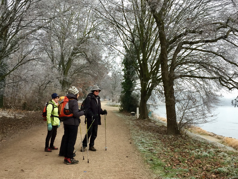 eine kleinere Gruppe wollte noch bei Tageslicht das neue Jahr gemeinsam begrüßen. Mittags an Neujahr wanderten wir nach Sekt und Häppchen nun entlang des Rheins auf die Reißinsel und genossen gemeinsam die raureifverzauberte Flusslandschaft.