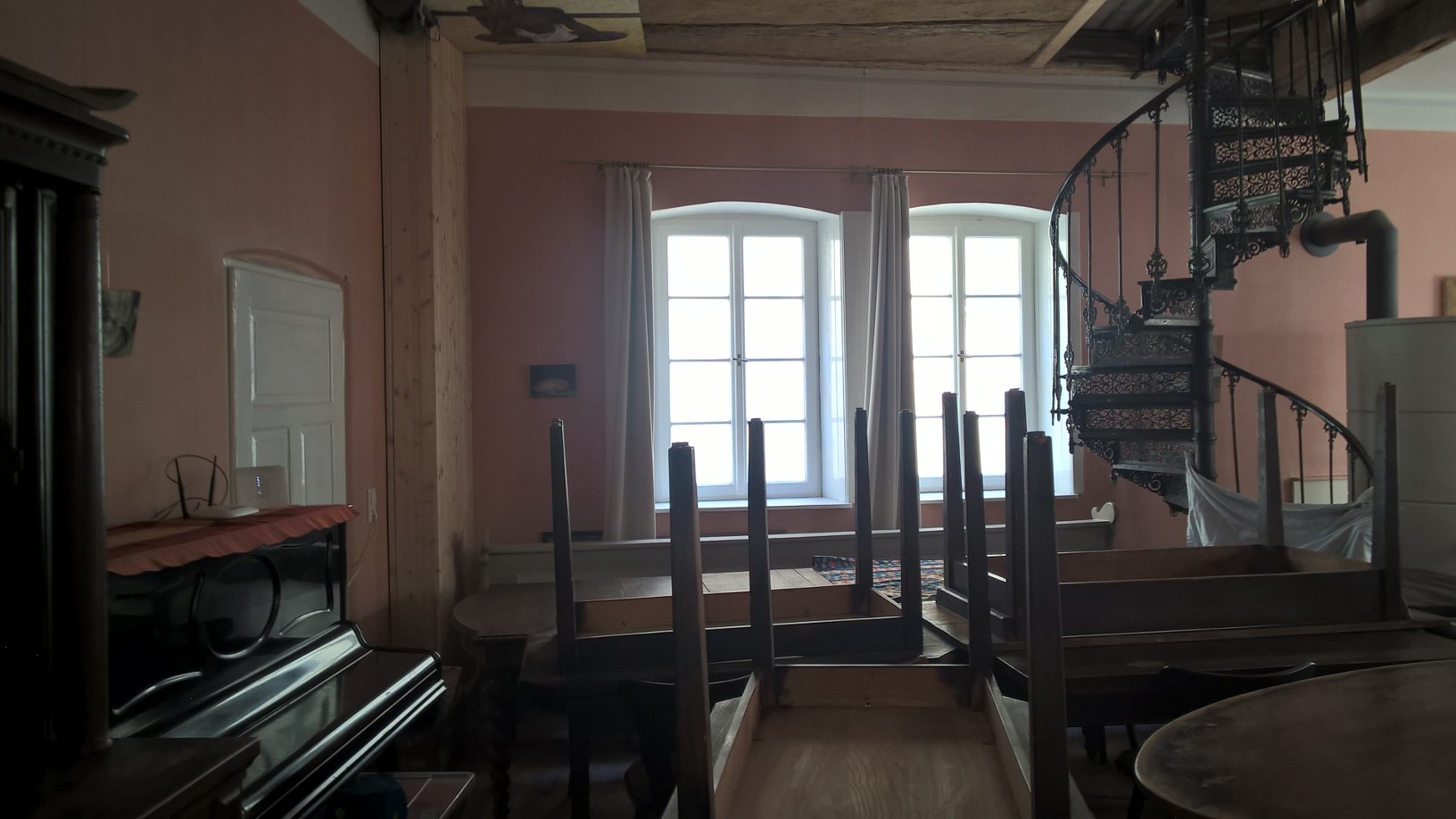 Gegenüber wurde vor langer Zeit schon das ehemalige gasthaus aufgekauft und wird seitdem in Absprche mit dem Denkmalamt vorsichtig renoviert. Zutage kammen originale Holzböden und wunderbare Wandmalereien aus den Jahren um 1880.