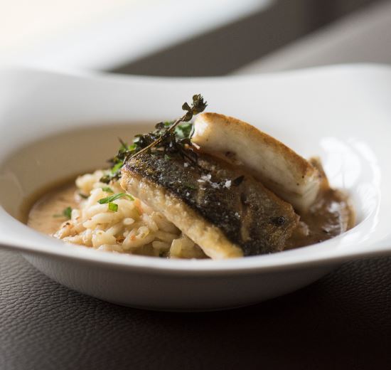 Anrichten: In einem tiefen Teller das Risotto anrichten. Das Wolfsbarschfilet auf das Risotto legen. Den Krustentierschaum aus dem ISI Gourmet seitlich herum angießen. Den Fisch mit Kräutern dekorieren.