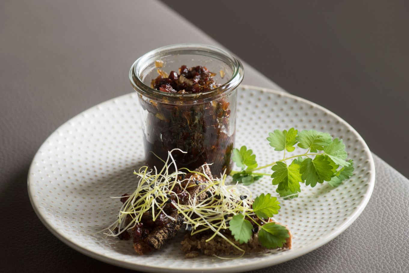 Die Marmelade auf Brot geben und mit ein paar Kräutern dekorieren oder in Gläschen verschenken. Sie hält sich im geschlossenen Gläschen im Kühlschrank mehrere Wochen.
