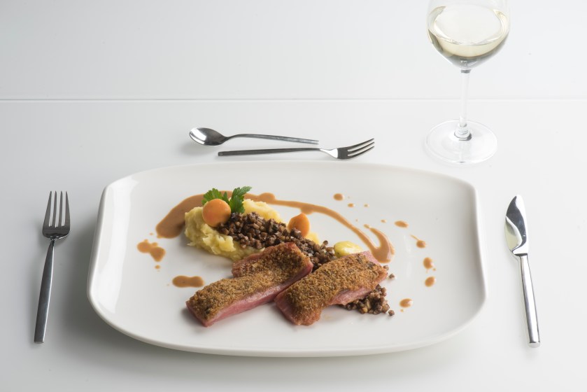 Das Fleisch kurz vor dem Servieren aus den Beuteln herausnehmen, trockentupfen und in Ghee kurz von beiden Seiten anbraten. In Portionstücke schneiden und mit der Kruste belegen. Unter dem Grill ca. 4 min bräunen.