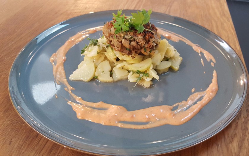 Der November mit seinen nebligen Tagen ruft wieder nach deftiger Kost. Nach der Arbeit oder aber auch nach einer schönen Herbstwanderung kommen Klassiker wie z.B. Frikadellen und Kartoffelsalat immer gut. Aber muss es immer Fleisch sein? Eine Alternative, die auch „eingefleischten Carnivoren“ (was für ein Pleonasmus 😉 ) schmeckt, und an mehreren dieser Spezies erfolgreich getestet wurde, sind Hackbällchen aus Austernpilzen. Diese haben einen feinen Geschmack, der sogar etwas an Kalbfleisch erinnert. Damit noch etwas mehr Biss reinkommt, habe ich sie mit Nüssen gemischt. Kräftig abgeschmeckt, und kross gebraten, passen sie, wie auch ihre fleischigen Kollegen, perfekt zum Kartoffelsalat (hier aus Bamberger Hörnla). Während sie in der Pfanne brutzeln, kann man noch eine schnelle Grillmayonnaise aus 3 Teilen Honigtomatenketchup (das ist er beste, da ohne Industriezucker) , 2 Teilen Mayonnaise und 1 Teil Srirachasoße (scharfe Chilisoße aus dem Asia-Regal) zusammenrühren. Und fertig ist ein wundervoll g`schmackiger Teller.