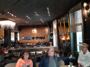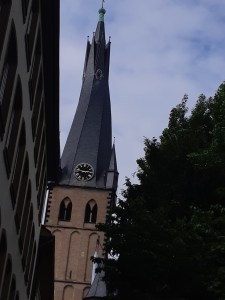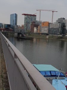 2. Mai: Spaziergang über Heinrich Heine Platz zum Kunstpalast, dort Besuch der Ausstellung „Zu schön um wahr zu sein“, alle dort ausgestellten Bilder waren von der Künstlerergruppe „Das Junge Rheinland“. Dann ein kurzer Spaziergang durch Hofgarten über Königsallee, Mittagessen im Café Heinemann (Slow Food Unterstützer), später etwas längerer, aber umso interessanter Spaziergang zum Medienhafen und zu dem erwarteter Regenschauer, darum sofort in die „MEERBAR“, in der selbst die Männer – Toiletten an einen Schiffsdampfer erinnern. Später Abendessen Brauhaus „Zum Schlüssel“.