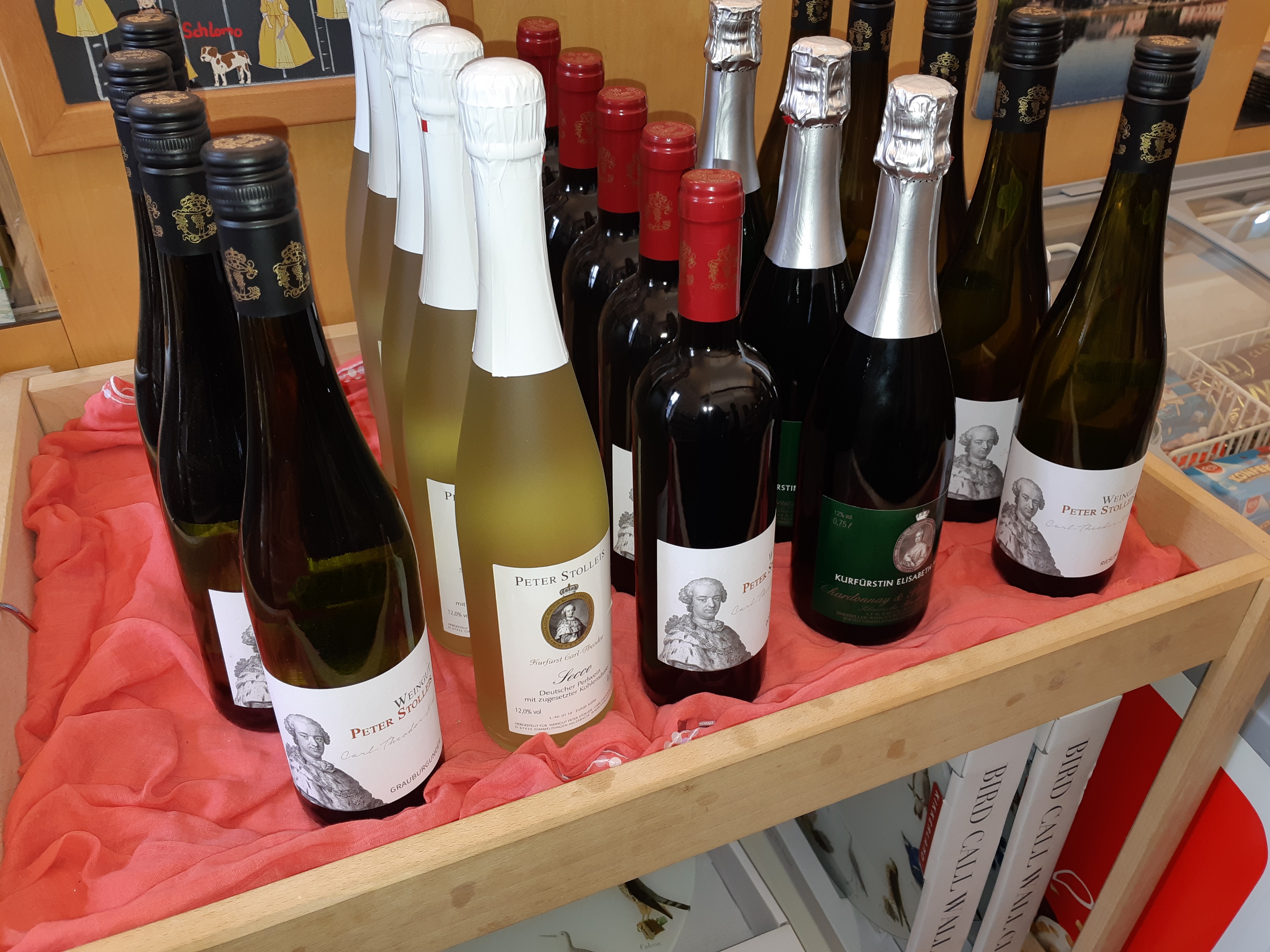 Foto oben: Nette Begegnung mit Pfälzer Produkten, denn das Weingut Peter Stolleis, Slow Food Pfalz – Mitglied seit 2014, hat als Etikett unseren/den Carl Theodor drauf und wird somit gerne im Düsseldorfer Schloß Benrath verkauft.