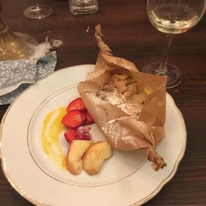 Es gab Saiblingstartar, mit Spargeltempura und kleinem Salat. Danach gebratene Forelle mit einer Kartoffel-grüner Spargel-Filorolle und zum Nachtisch Rhabarbercrumble mit Erdbeeren.