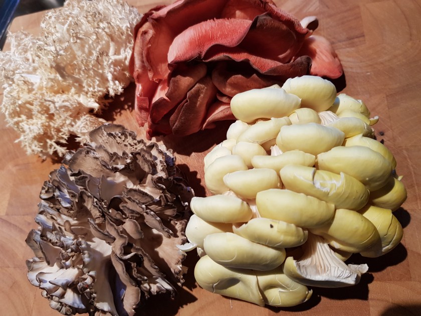 Rosenseitling, Limonenseitling, Maitake und der Friseepilz waren nur vier einer Vielzahl dargebotener Pilze eines Odenwälder Biopilz-Züchters, der seine Produkte aktuell auf den Märkten der Umgebung feilbietet. Irre sehen die aus, dachte ich mir, richtig verlockend. Und gegessen hatte ich solche Exemplare auch noch nicht. Also nichts wie ran an das Abenteuer. Um die Sorten miteinander gut vergleichen zu können, verarbeitete ich alle -kurz angebraten- zu einem Carpaccio. Und wie das geht, und vor allem wie es schmeckt, könnt ihr hier lesen: