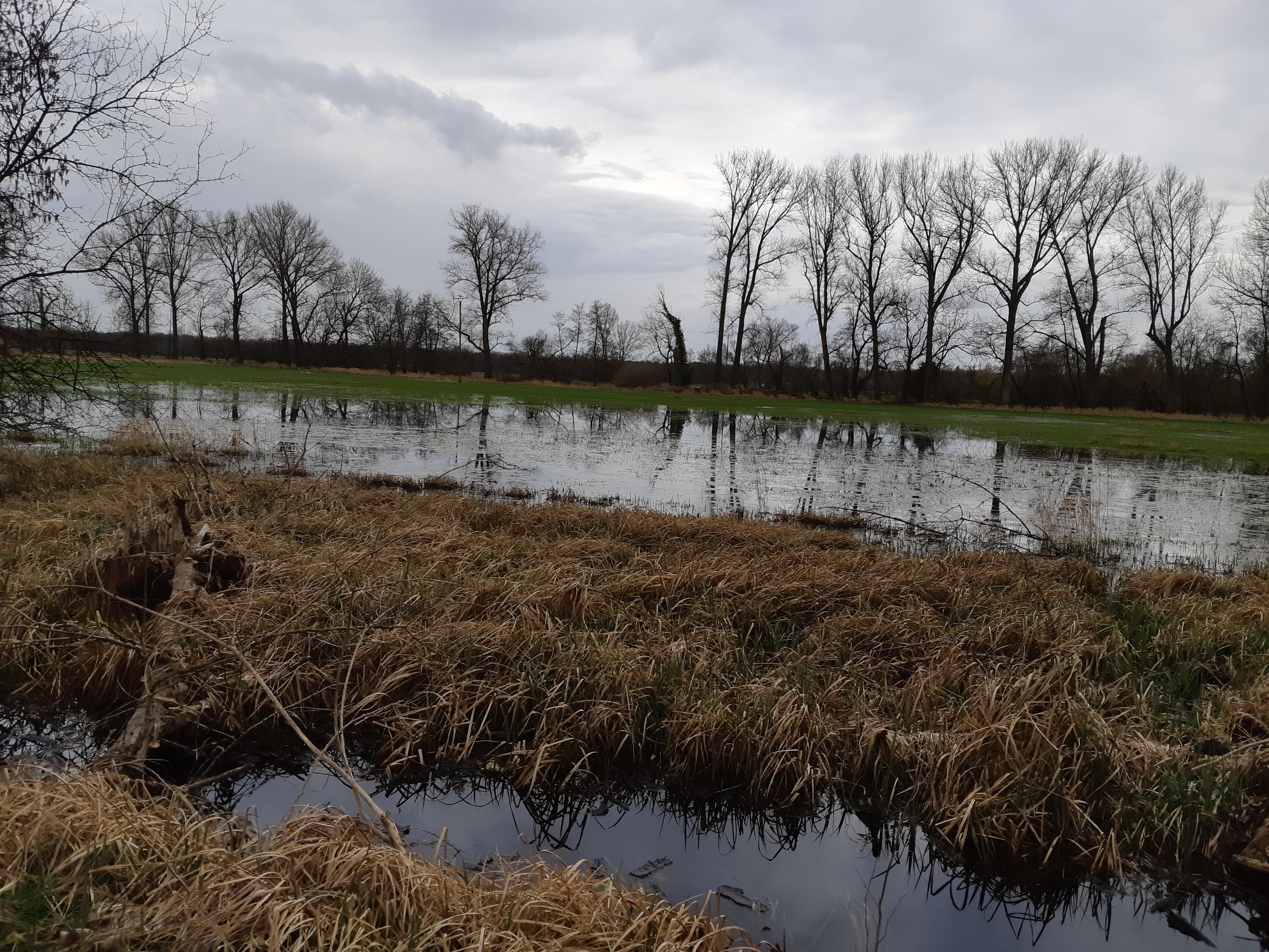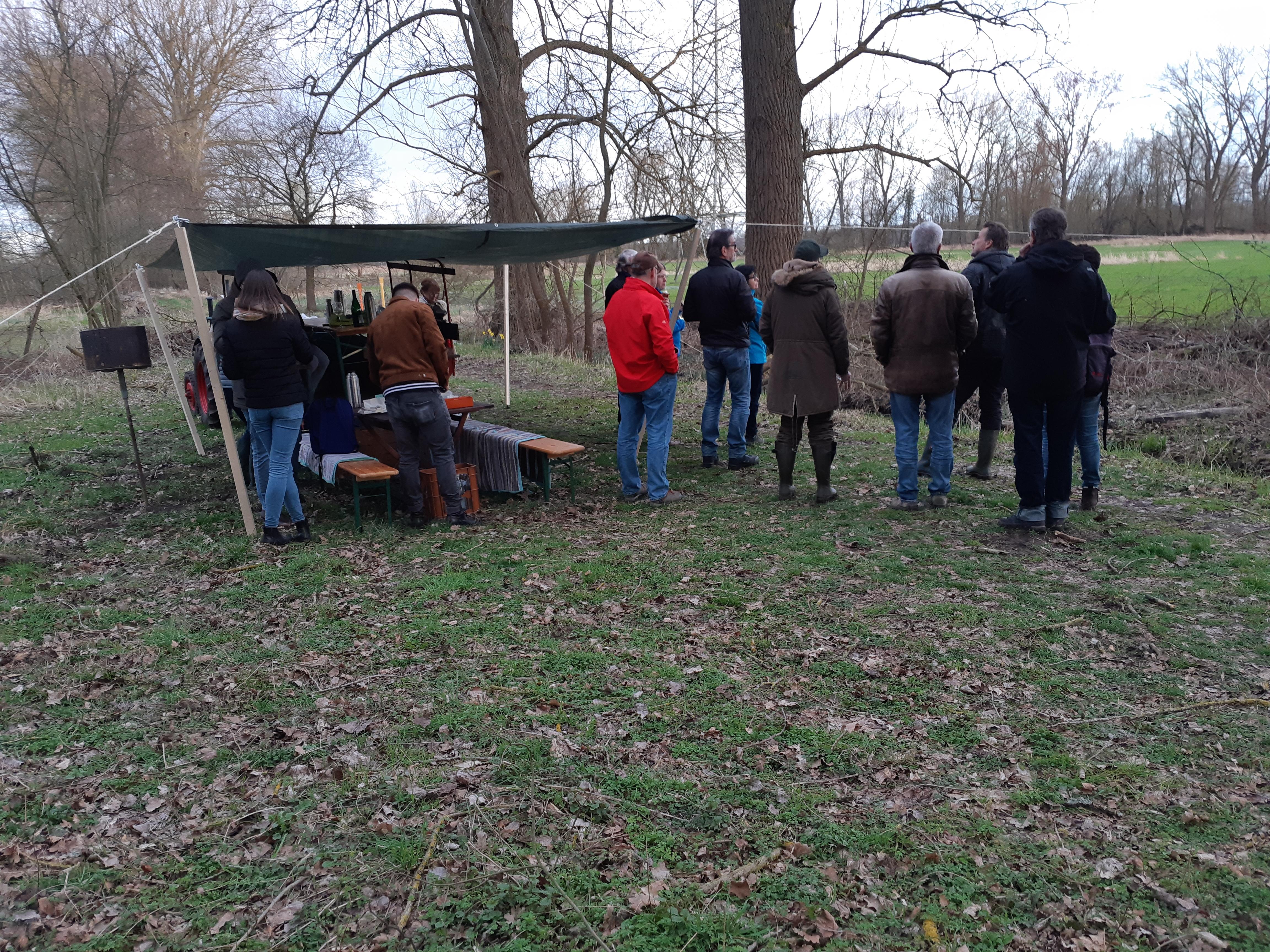 Martin Grund erläuterte nicht nur den Zusammenhang von Hochwasser am Rhein und überflutenden Wiesen und Wälder am Geinsheimer Gänsbuckel, sondern zeigte uns in einem weltweit genormten Schöpfbecher die jetzt schon stark vorhandenen Kleinkrebse (Stichwort „Vorstellung von Ergebnissen des Stechmückenlarvenmonitorings“, siehe http://nabu-nw.de/besuch-im-ortsbeirat-geinsheim-nabu-stellt-zusammen-mit-der-kabs-ergebnisse-des-stechmueckenlarven-monitorings-in-geinsheimer-ueberschwemmungsgebieten-vor/), die sich innerhalb von wenigen Wochen nach der Flutung zeigen. Über die verschiedenen Vogelrufe angesprochen, wurden wir aufmerksam gemacht auch auf Graugänse, Kanadagänse, Haubentaucher, Grau- und Silberreiher, Eisvögeln, Schwarz- und Buntspechten, Höckerschwänen und seltene Amphibien wie z. B. den blauen Moorfrosch (https://de.wikipedia.org/wiki/Moorfrosch).