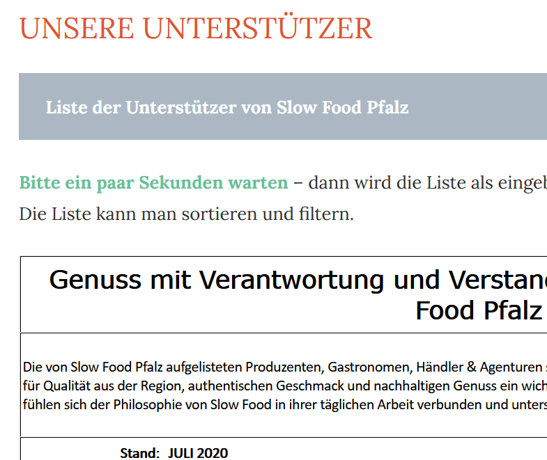 Unsere alte „Genusskarte“ ist jetzt nicht mehr online. Seit kurzem zeigt die Karte auf den Slow Food Webseiten auch automatisch alle Unterstützer an. Daher müssen wir diese im Vergleich zur alten Karte nicht mehr händisch pflegen. Die filterbare Karte ist unter https://www.slowfood.de/slow_food_vor_ort/pfalz zu finden. - Neue Seite „Unsere Unterstützer„