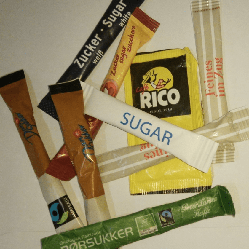 Wer kennt sie nicht, die Portionsbeutel mit Zucker drin, die man im Gasthaus oder Kaffee zu gleichnamigen Getränk auf der Untertasse findet. Praktisch wenn man diese Zuckermenge in seinem Getränk möchte. Aber was, wenn man sein Getränk ungesüßt trinkt? – dann werden diese Zuckerpäckchen zu wahren Multitalenten: Sie sind Spielzeug für unruhige Finger, Sammelobjekt, saugen verschütteten Tee auf oder werden mit ein paar Kaffeespritzern zum einmaligen Kunstobjekt!