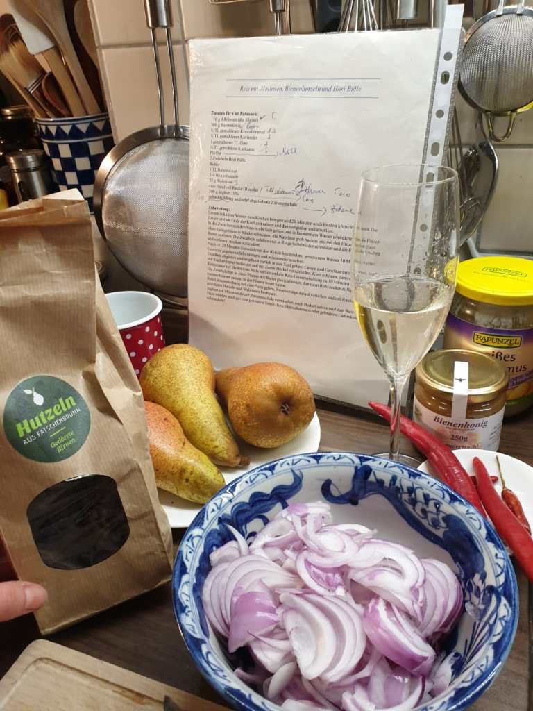 Der Pfeffer gab der Rotkohlsuppe, die aus dem Teller leuchtete, ein wunderbares Aroma! Er passt auch hervorragend zu Wild, Lamm und Ente,…. man kann ihn aber auch mal in einer dunklen Mousse au Chocolat probieren. Zum Hauptgang dann Reis und Alblinsen, eine wunderbare Proteinkombi, die Höri Bülle steuerte dezente Schärfe, die angerösteten Birnenhutzeln und Walnüsse die Süße und den Biss dazu! Zum Dessert ein Teil des Schaumweins aus der Champagnerbratbirne im Sabayon und der Rest im Glas! So lecker!