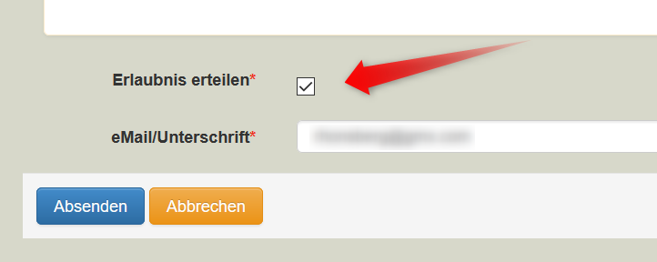 Nun setzten sie hier einfach das Häkchen bei „Erlaubnis erteilen“, geben Ihre E-Mail-Adresse ein, die Sie auch zur Registrierung verwendet haben und klicken auf „Absenden“.