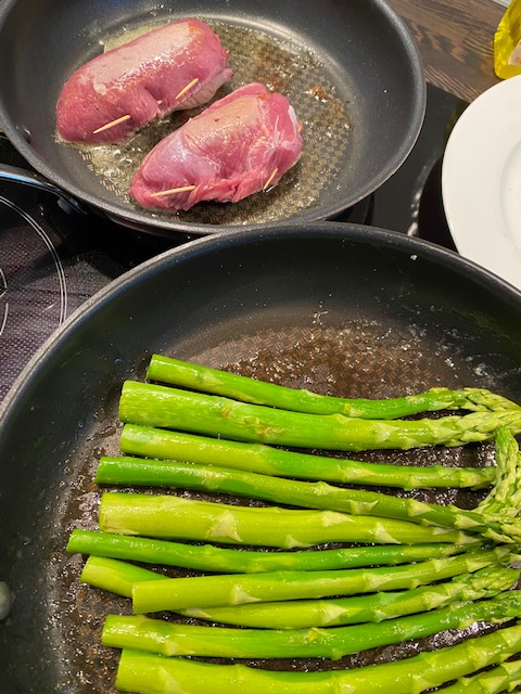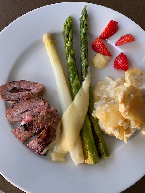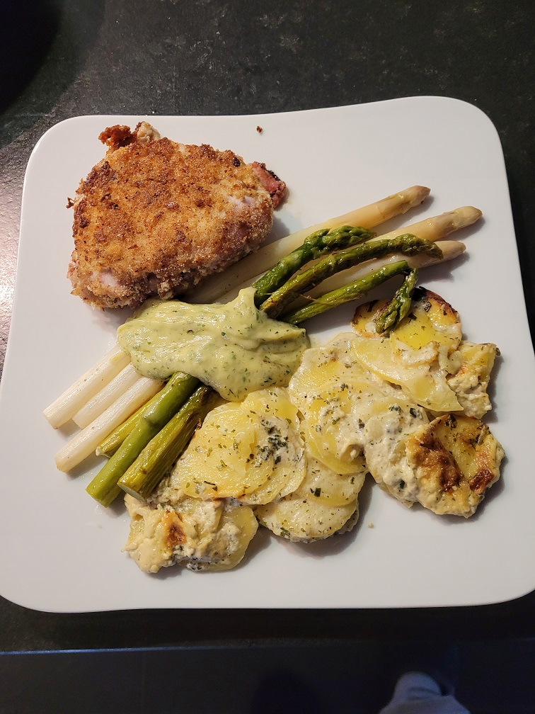 2. Gang: Cordon-Bleu gefüllt mit Erdbeeren und Bergkäse, gebratener Spargel mit Kartoffelhollandaise und Kräuter-Kartoffelgratin: