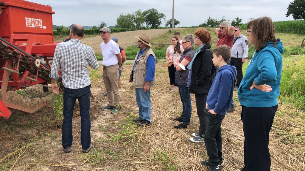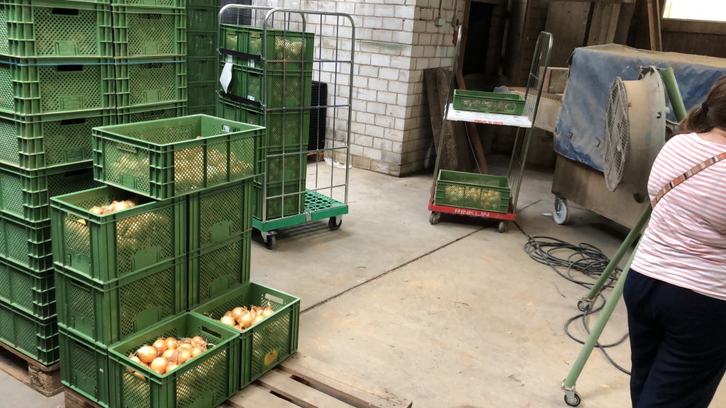 Da wir seit anderthalb Jahren die erste Gruppe zur Hofbesichtigung waren, zeigte Herr Kalinke sich als äußerst redseliger Führer. In der Scheune erklärte er uns die Funktion der sogenannten Karottenwaschanlage und der Sortieranlage von Kartoffeln, die nach der Ernte nicht gewaschen werden, damit sie besser lagerfähig sind und nicht ihren Geschmack verlieren. Anschließend machten wir noch einen Abstecher zum abgeernteten Karottenfeld, wo er uns die Funktion der Erntemaschine beschrieb……ein äußerst diffiziles Ding. Überall wuchs das Unkraut, zum Leidwesen auch auf dem Kürbisfeld. Aber es ist nun mal ein Biolandbetrieb, wo nicht gespritzt werden darf.