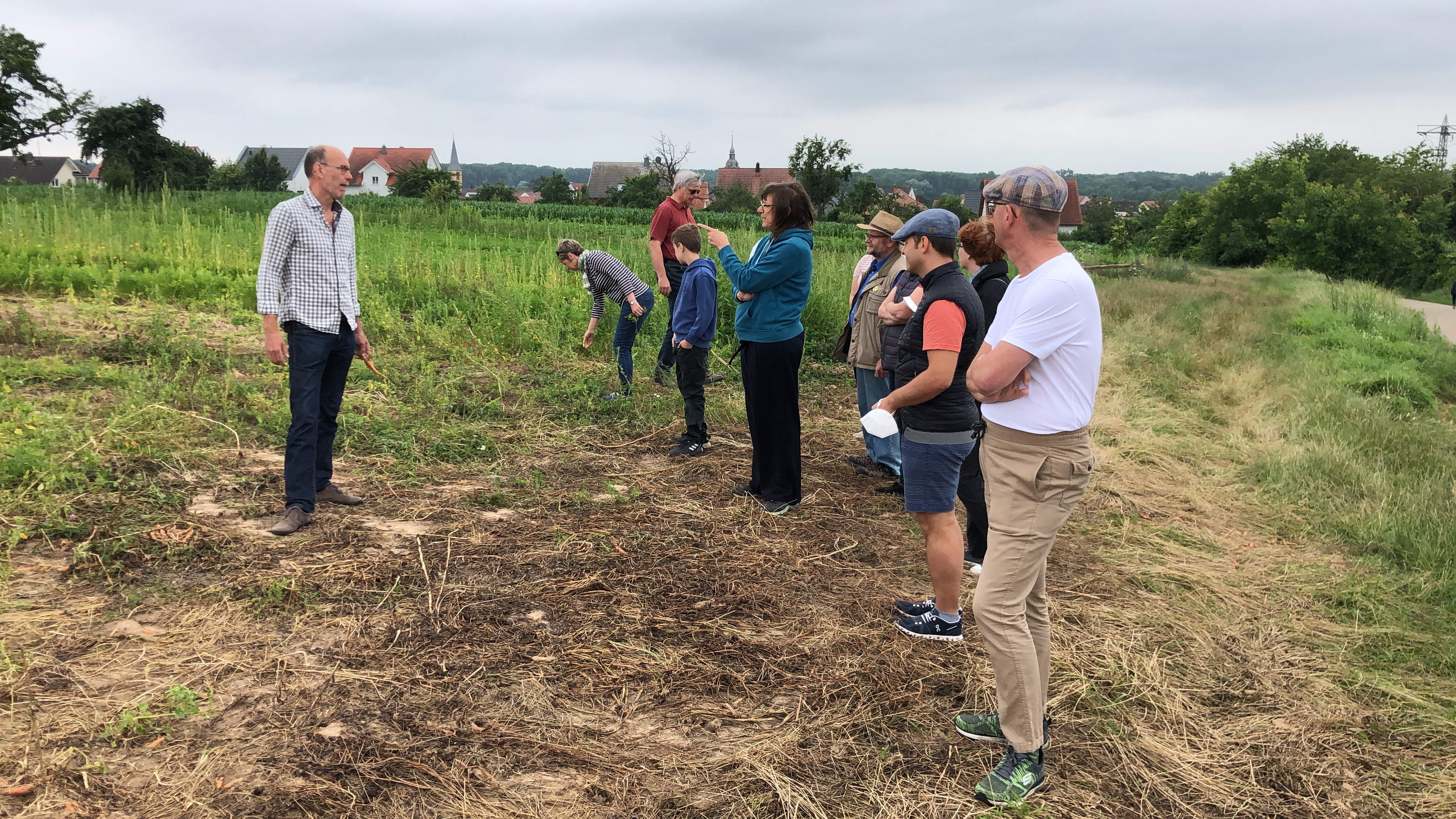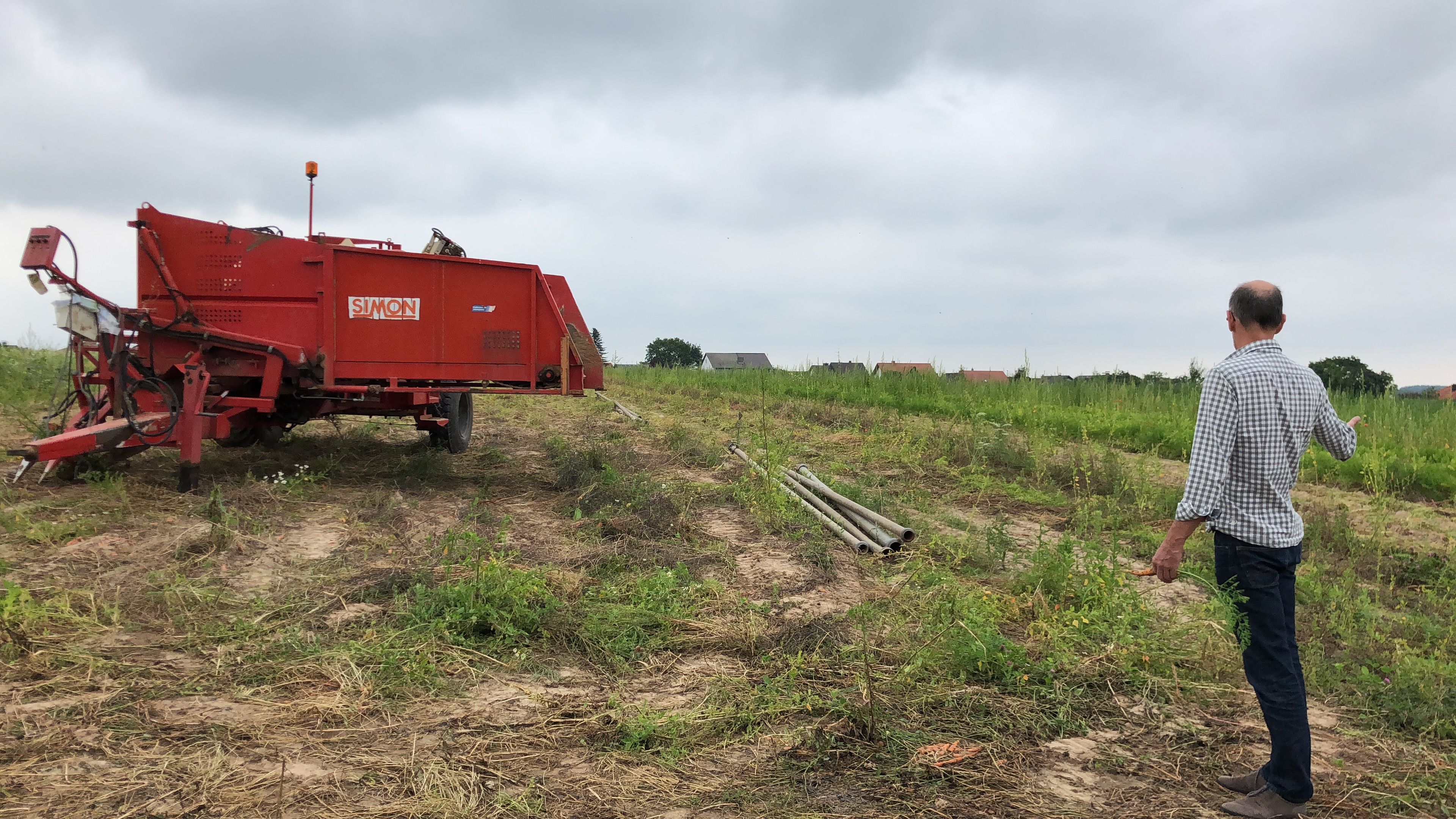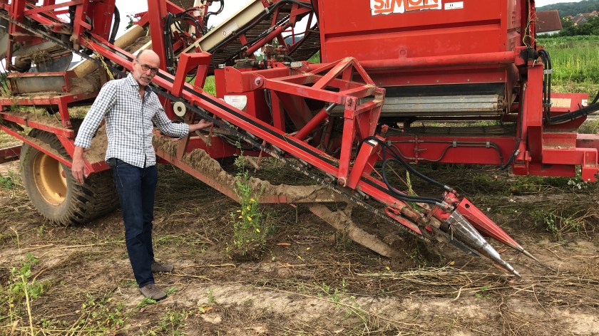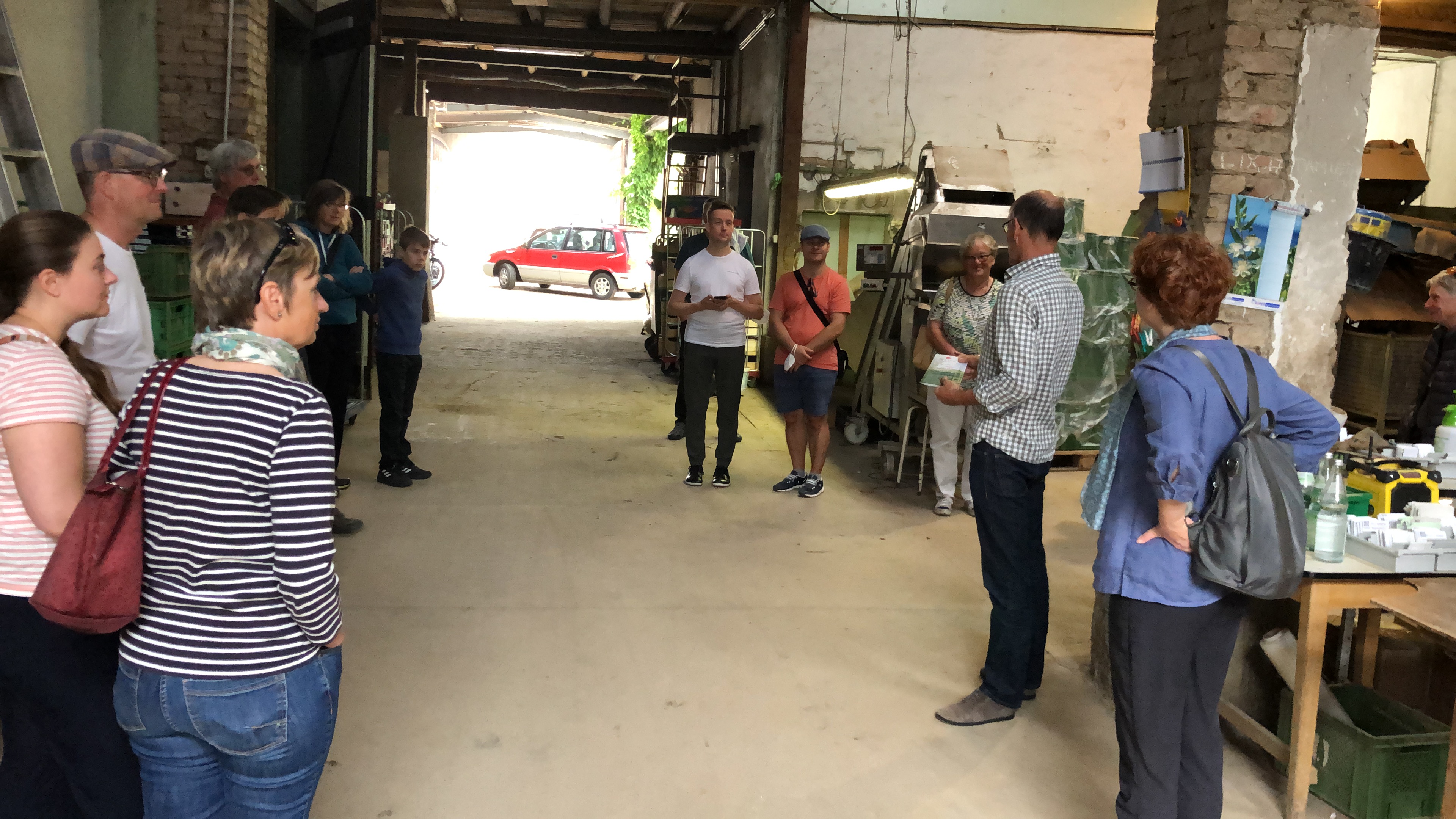 Da wir seit anderthalb Jahren die erste Gruppe zur Hofbesichtigung waren, zeigte Herr Kalinke sich als äußerst redseliger Führer. In der Scheune erklärte er uns die Funktion der sogenannten Karottenwaschanlage und der Sortieranlage von Kartoffeln, die nach der Ernte nicht gewaschen werden, damit sie besser lagerfähig sind und nicht ihren Geschmack verlieren. Anschließend machten wir noch einen Abstecher zum abgeernteten Karottenfeld, wo er uns die Funktion der Erntemaschine beschrieb……ein äußerst diffiziles Ding. Überall wuchs das Unkraut, zum Leidwesen auch auf dem Kürbisfeld. Aber es ist nun mal ein Biolandbetrieb, wo nicht gespritzt werden darf.