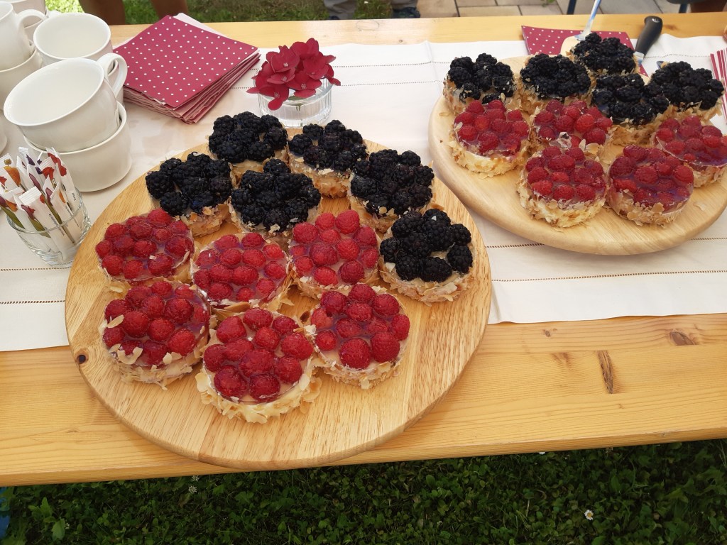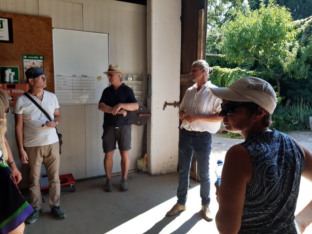 Nach der Sonne und den Erdbeeren nähern wir uns dem Bauerngarten der Familie und freuen uns auf den Schatten. Dort probieren wir allerlei Säfte. Die Bio-Konditorei „Löwenzahn“ aus Gommersheim hat Beerentörtchen gezaubert, eiskalt serviert zu einer Tasse Kaffee. Diskussionen über Kreislaufwirtschaft und Verbraucherverhalten machen alle nachdenklich. Was sind wir bereit, in nachhaltige Kreisläufe zu investieren? Sind wir bereit, Erzeuger direkt vor Ort zu unterstützen und in den Hofläden einzukaufen? Die Slow Food Prinzipien finden wir hier jedenfalls alle wieder.