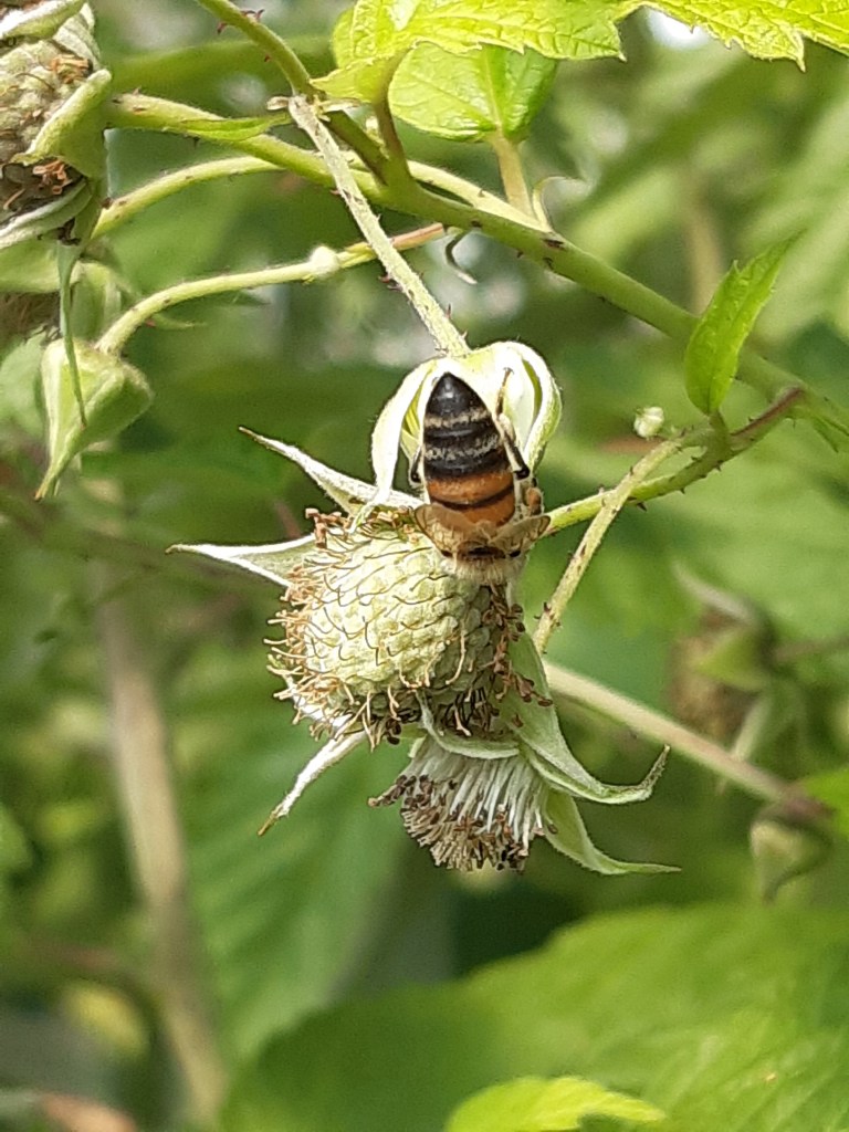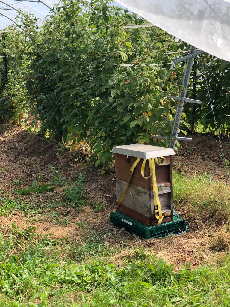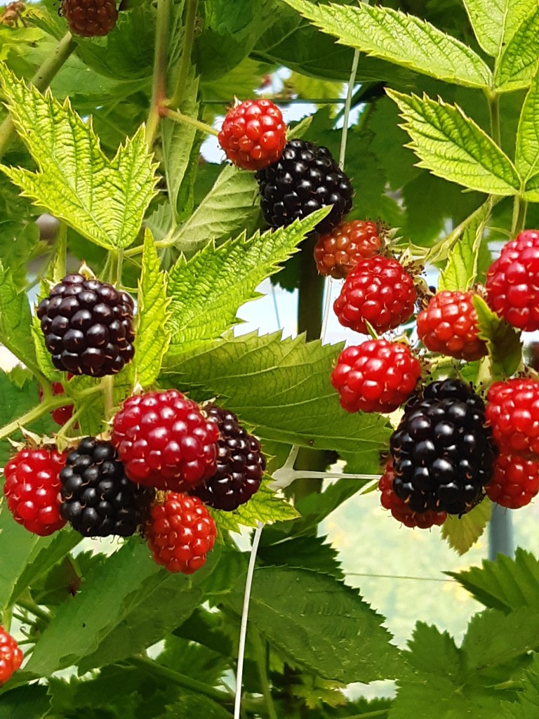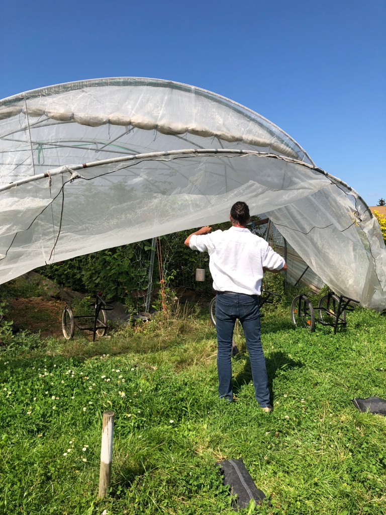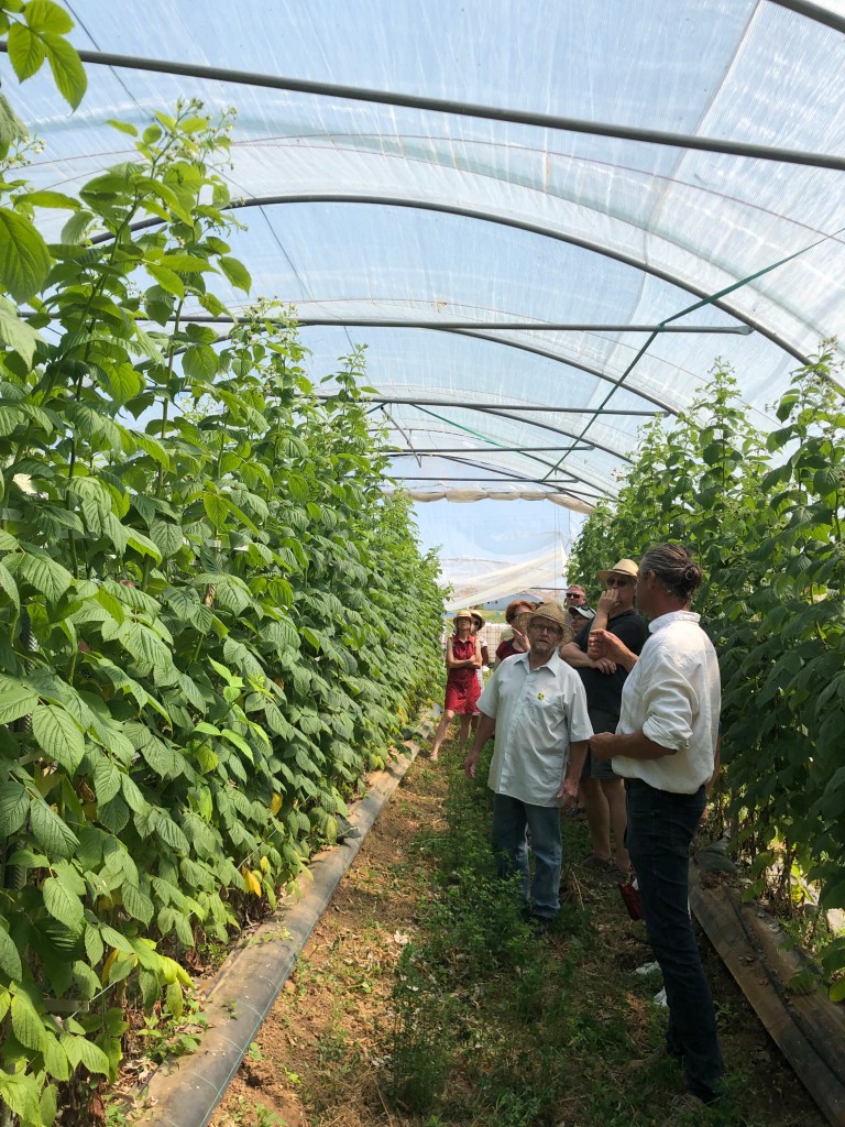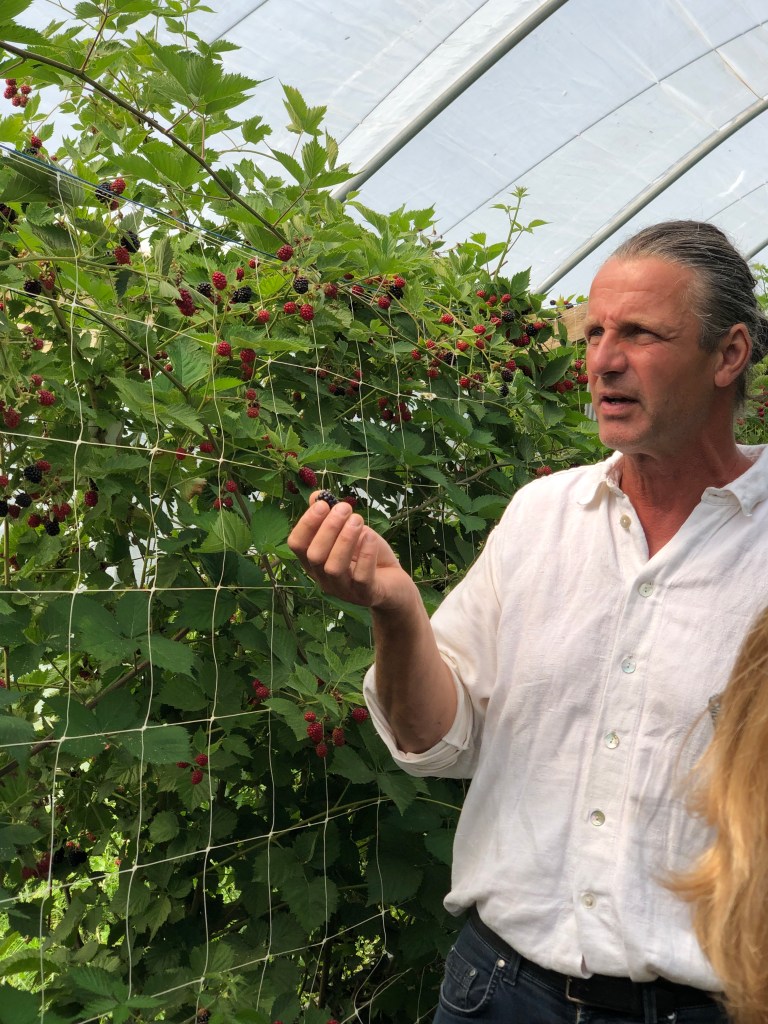 Die Spargelzeit ist vorbei, dafür dürfen wir in den 50m langen Tunnel bei den Beeren zugreifen und die Sorten vergleichen. Die Brombeeren sind riesig und der Farbverlauf von den noch unreifen Beeren zur reifen Beeren sieht einfach wunderschön aus, wie gemalt: „Picasso hat bei uns gelernt“, meint Renner lachend. Erst wenn eine Brombeere eine matte schwarze Farbe hat und sich leicht löst, dann ist sie reif zum Pflücken. Die ersten Brombeeren verschwinden in den Mündern der Gruppe. Dann wechseln wir zu den Himbeeren. Renner erzählt von zunehmenden Klimaveränderung und den Auswirkungen von Sturmschäden auf die Tunnel. Beeren jedoch müssen unter Tunnel angebaut werden. Ein schützendes Dach hält Regen fern und damit Pilzinfektionen, Schattiernetze verhindern Sonnenbrand. Ein weiterer Vorteil ist die Möglichkeit die Kirschessigfliege “auszusperren“. Ein 0,8mm Netzgeflecht wird aufgelegt und verhindert den Zuflug der KEF.