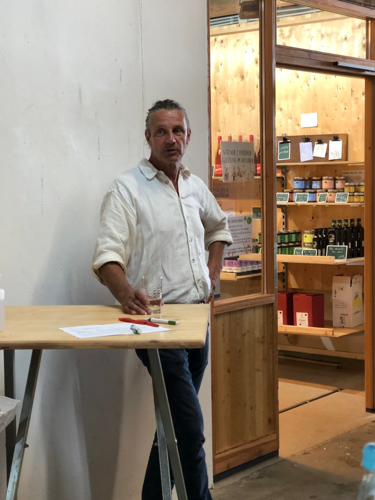 Im Hof der Familie von Dieter Renner versammeln sich rund 20 „Slowfoodies“: die einen kommen aus allen Himmelsrichtungen der Pfalz, andere leben in Darmstadt, sind aber in der Pfalz geboren, und wieder andere komme aus Darmstadt, leben in Rheinhessen und finden alles, was Slow Food Pfalz anbietet, einfach mitmachenswert! Die ersten Gespräche ranken sich rund um saisonale Rezepte mit Feigen und Aprikosen, das Bio-Gemüse von Martin Renner direkt am Ortsausgang – oder das Spargelhähnchen. Wer jetzt das wunderbare Bio-Stangengemüse der Familie Renner vor Augen hat, begleitet von einem saftigen Bio Huhn, der liegt total falsch! Also einfach mal recherchieren, was es mit diesem „Hähnchen“ auf sich hat.