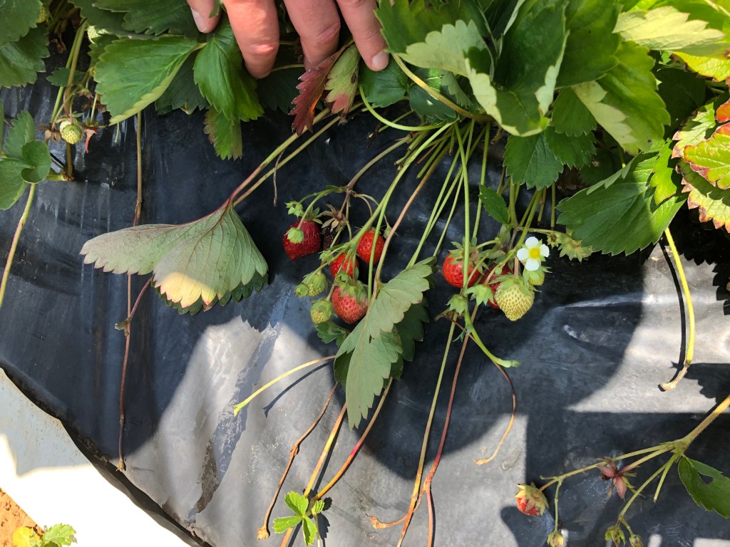 Nach den Himbeeren und Brombeeren ruft das Erdbeerfeld: jeder darf sich eine Reihe aussuchen und die letzten Erdbeeren naschen. So eine warme Erdbeere direkt vom Strauch schmeckt wunderbar aromatisch.