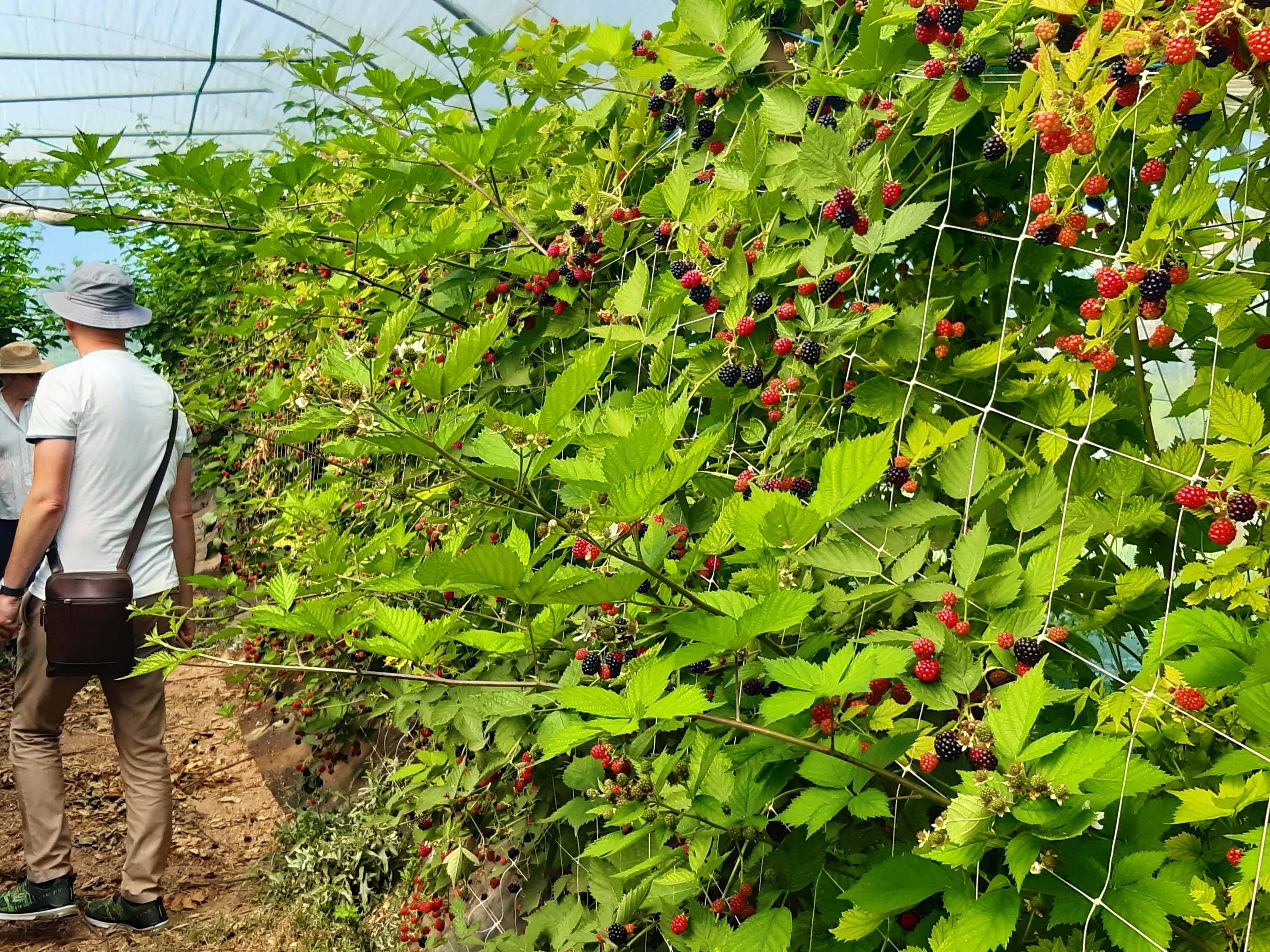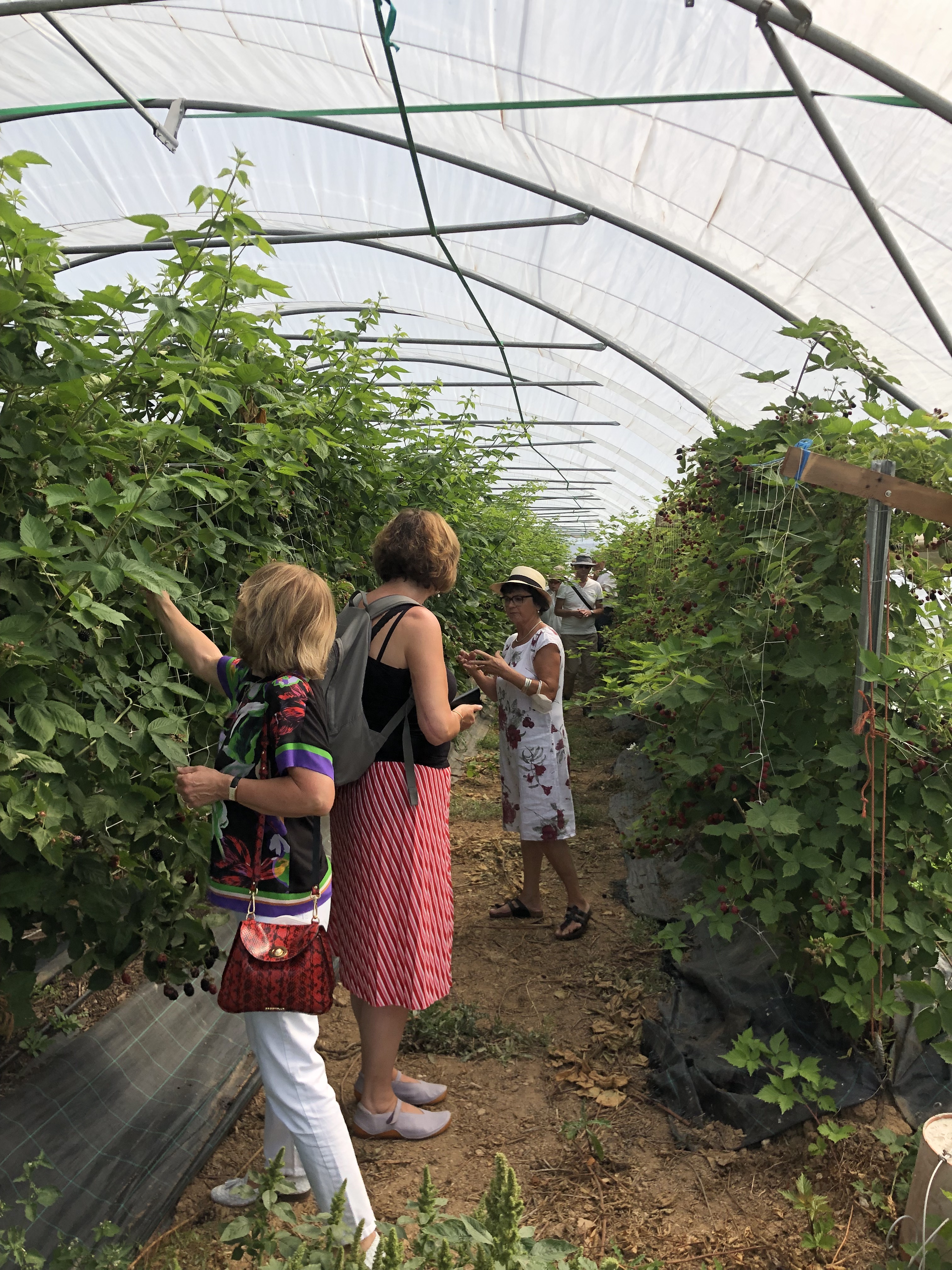Die Spargelzeit ist vorbei, dafür dürfen wir in den 50m langen Tunnel bei den Beeren zugreifen und die Sorten vergleichen. Die Brombeeren sind riesig und der Farbverlauf von den noch unreifen Beeren zur reifen Beeren sieht einfach wunderschön aus, wie gemalt: „Picasso hat bei uns gelernt“, meint Renner lachend. Erst wenn eine Brombeere eine matte schwarze Farbe hat und sich leicht löst, dann ist sie reif zum Pflücken. Die ersten Brombeeren verschwinden in den Mündern der Gruppe. Dann wechseln wir zu den Himbeeren. Renner erzählt von zunehmenden Klimaveränderung und den Auswirkungen von Sturmschäden auf die Tunnel. Beeren jedoch müssen unter Tunnel angebaut werden. Ein schützendes Dach hält Regen fern und damit Pilzinfektionen, Schattiernetze verhindern Sonnenbrand. Ein weiterer Vorteil ist die Möglichkeit die Kirschessigfliege “auszusperren“. Ein 0,8mm Netzgeflecht wird aufgelegt und verhindert den Zuflug der KEF.