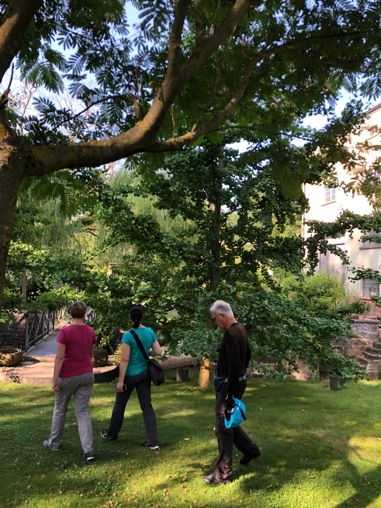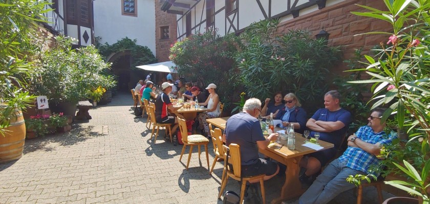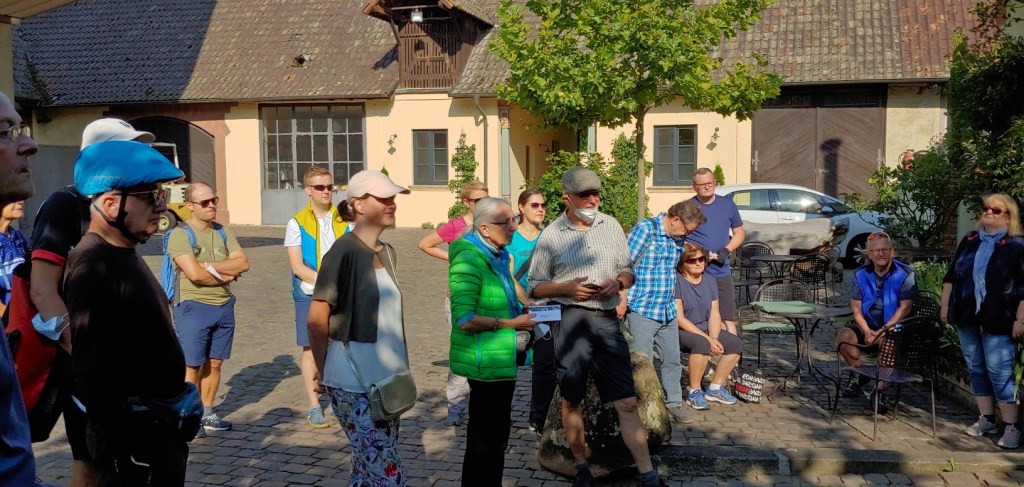 Gut gestärkt führte uns die Tour u.a. vorbei an dem alten jüdischen Friedhof in Essingen zum Bioland Weingut Pfaffmann 1616 in Walsheim. Dort wurden wir vom äußerst sympathischen Winzerpaar im idyllischen Innenhof mit liebevoll gedeckten Tischen erwartet. Kanupriya Hener hatte landestypische Gerichte aus Ihrer Heimat Indien vorbereitet, die perfekt mit den begleitenden Weinen harmonisierten. Nach der anschließenden Weingutbesichtigung mit Pavel Hener machten wir uns auf den Rückweg, teilweise entlang der Queich, nach Ottersheim. Nach einem erfrischenden und köstlichen Eis führte uns die Tour bei wunderbarer Abendsonne zurück zum Startpunkt. Wir resümierten einen wunderbaren Tag für Leib und Seele.