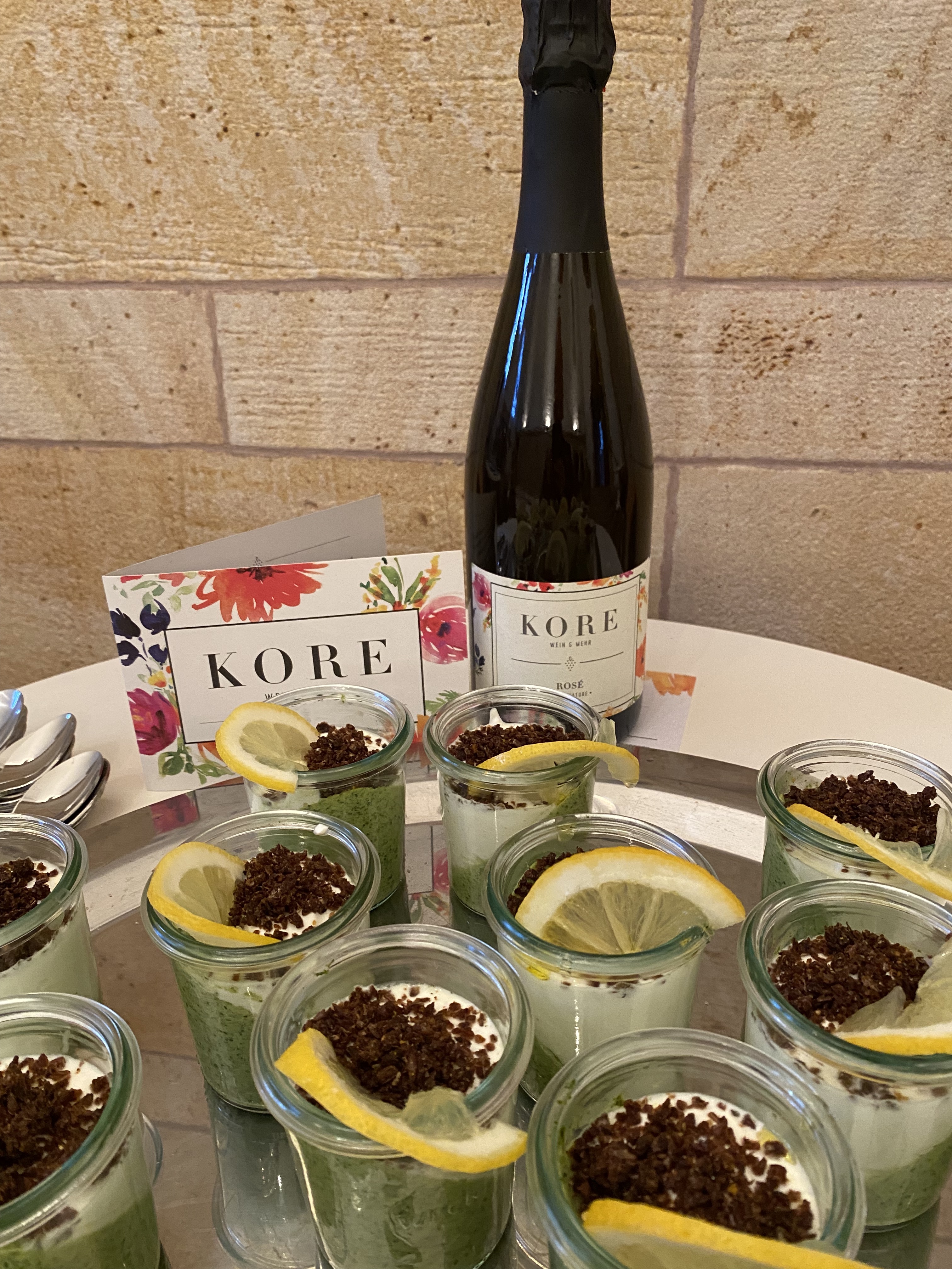 Zu der zum Aperitif vorbereiteten Grünkohlmousse im Glas mit Joghurt-Meerrettichcreme, Pumpernickelcrunch und Amalfi- Zitrone gab es einen Rosé Sekt brut nature (2019).
