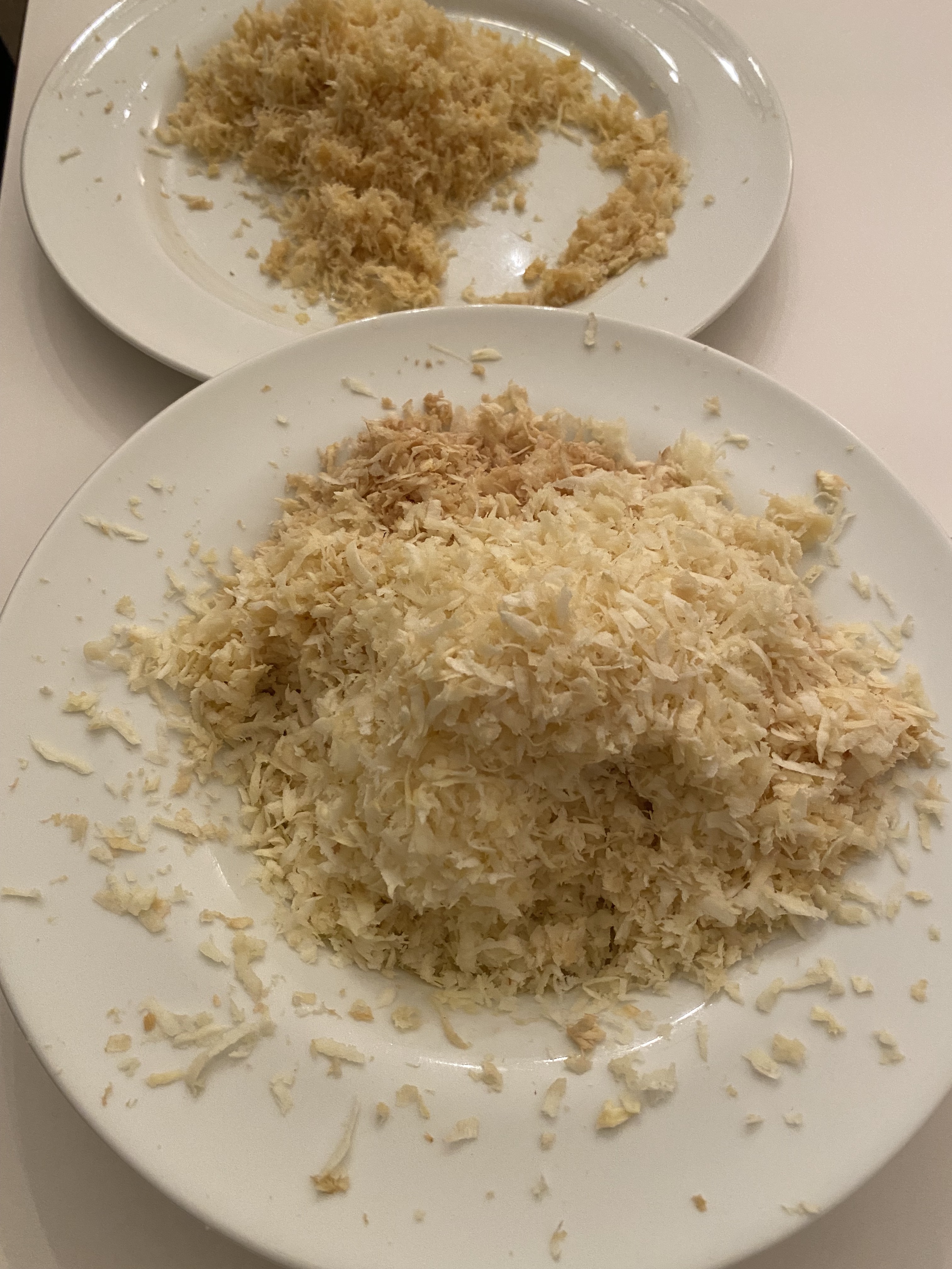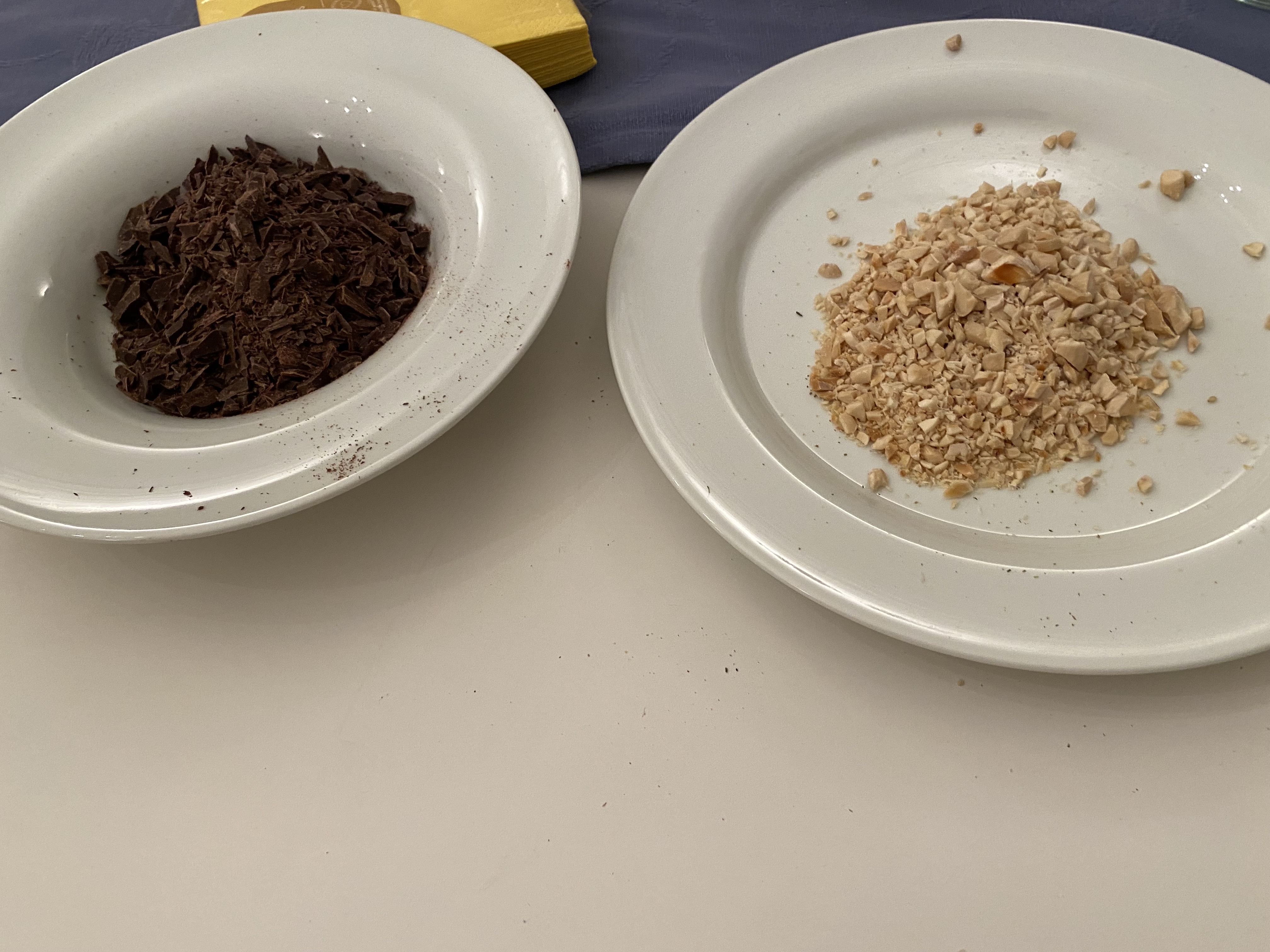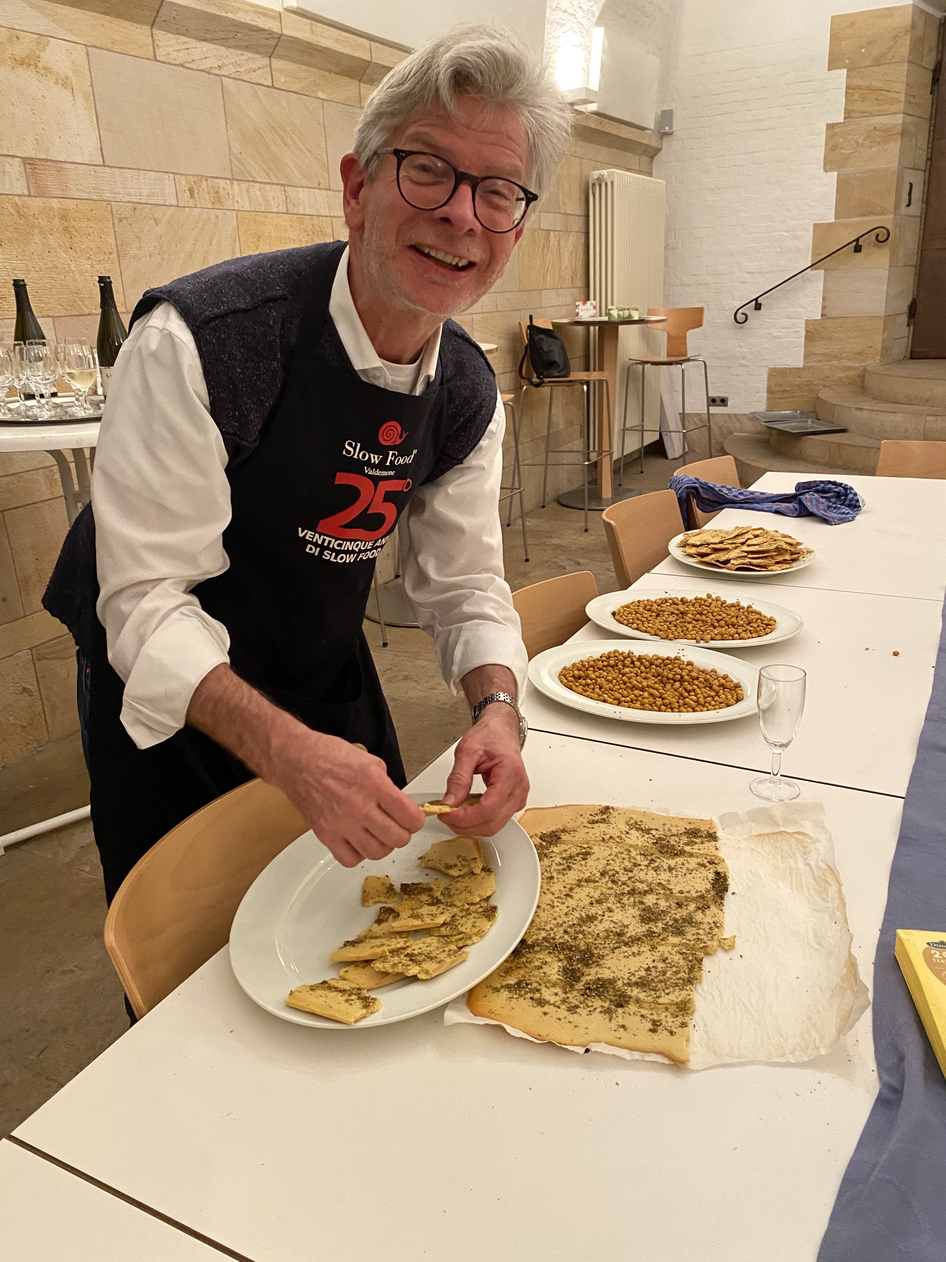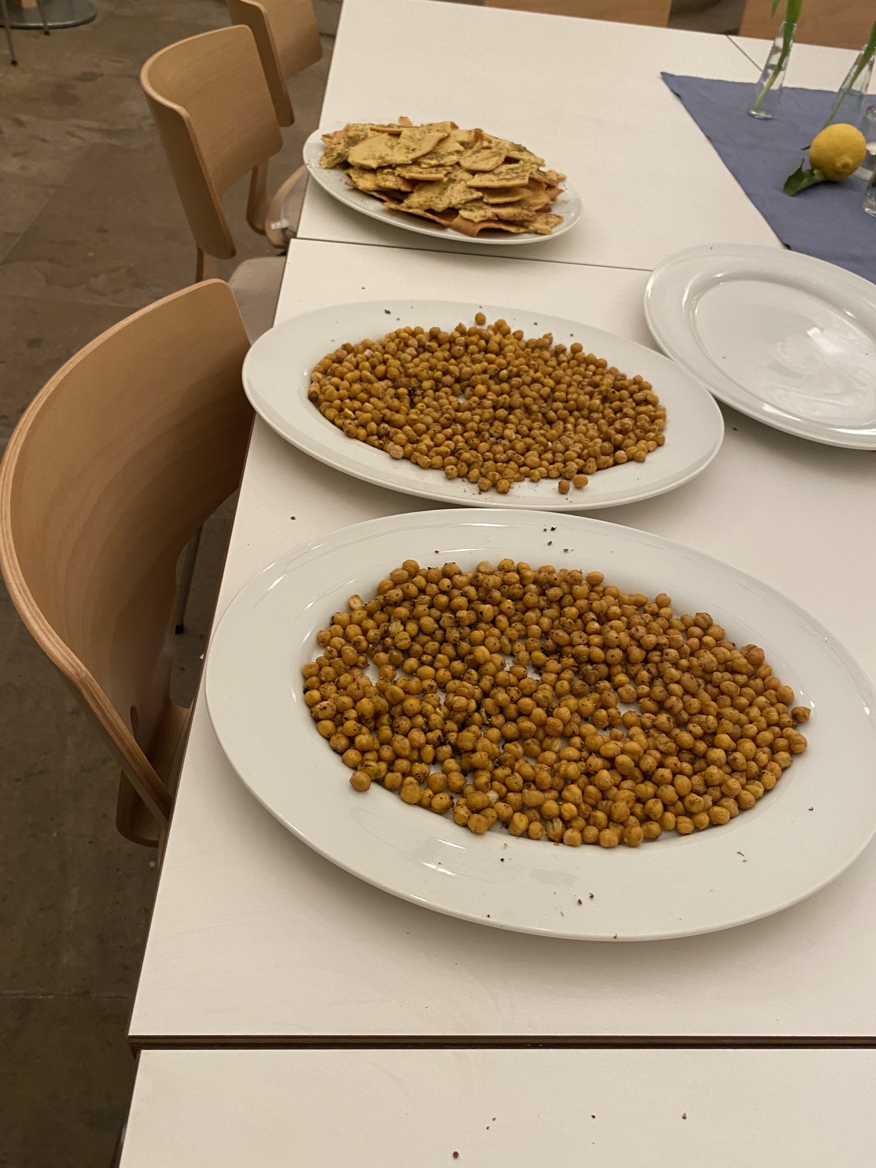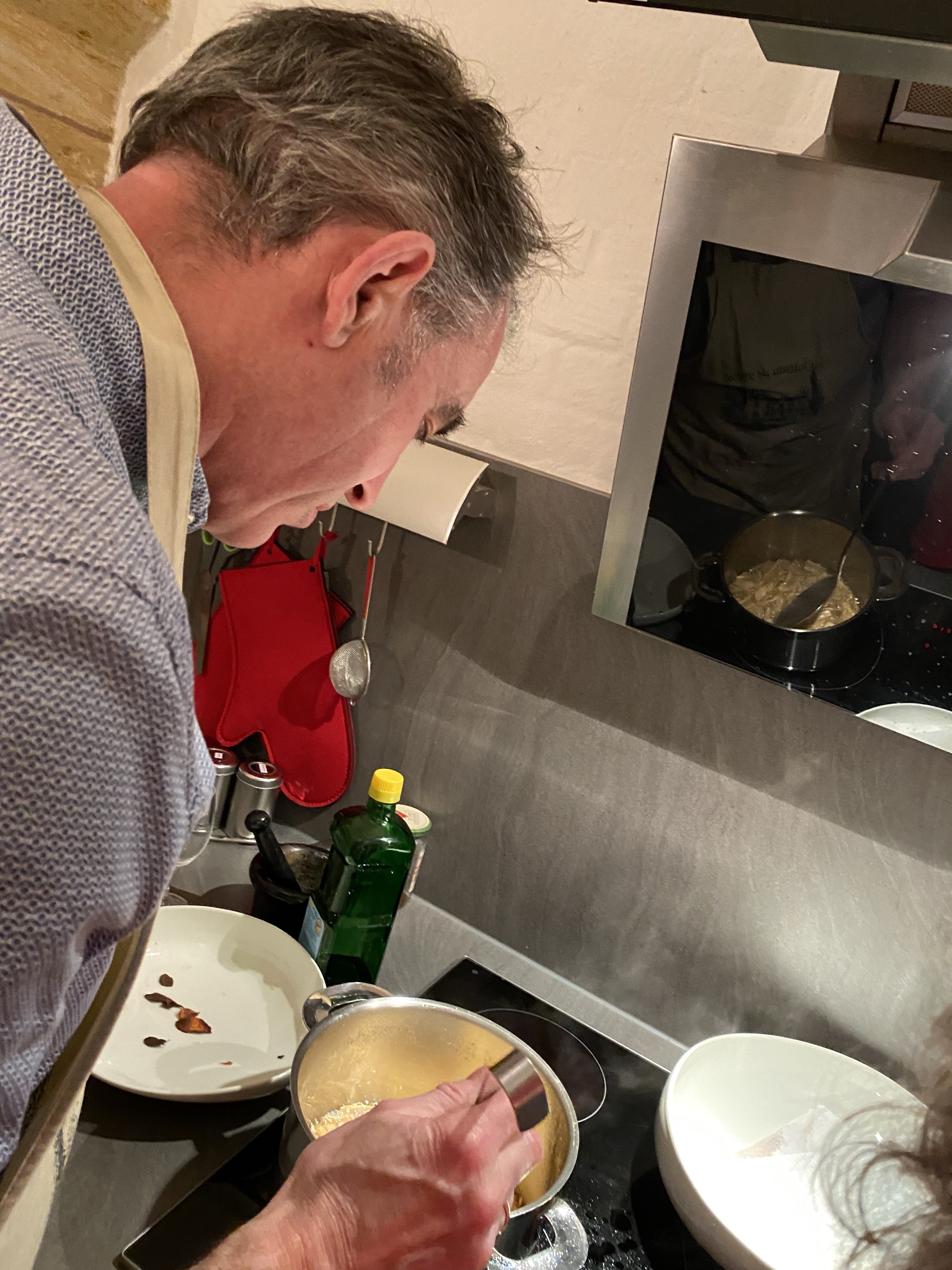Dann war heftig Küchenarbeit angesagt, um die Vorspeise und Teile des Hauptgerichts zuzubereiten, z.B. Schwarzwurzeln putzen, Kichererbsen rösten, Socca zu backen…..