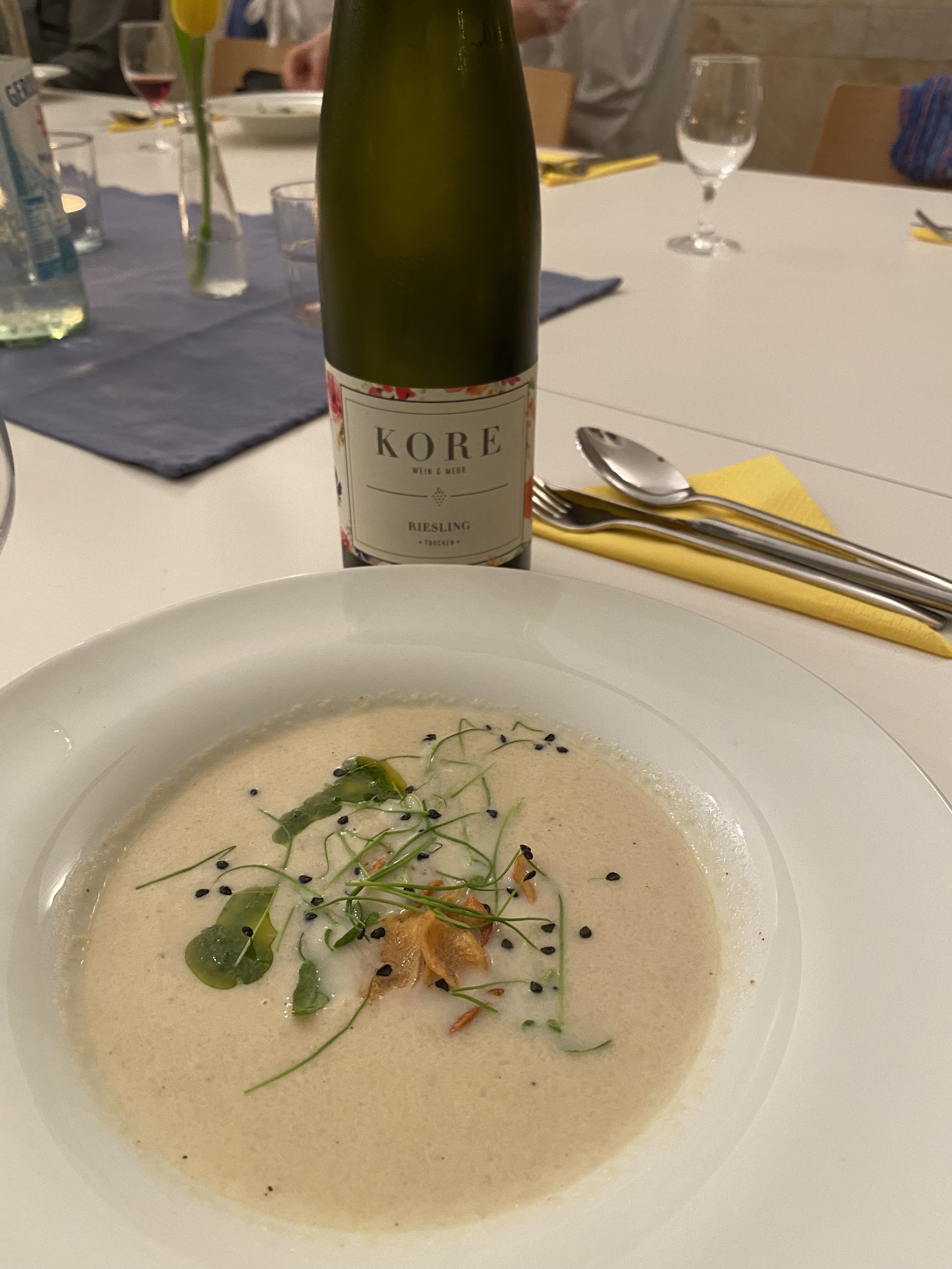 Zur Schwarzwurzelsuppe mit ihren Chips und Brunnenkresseöl schmeckte uns der 2020er Riesling Ruppertsberg & Deidesheim sehr gut.