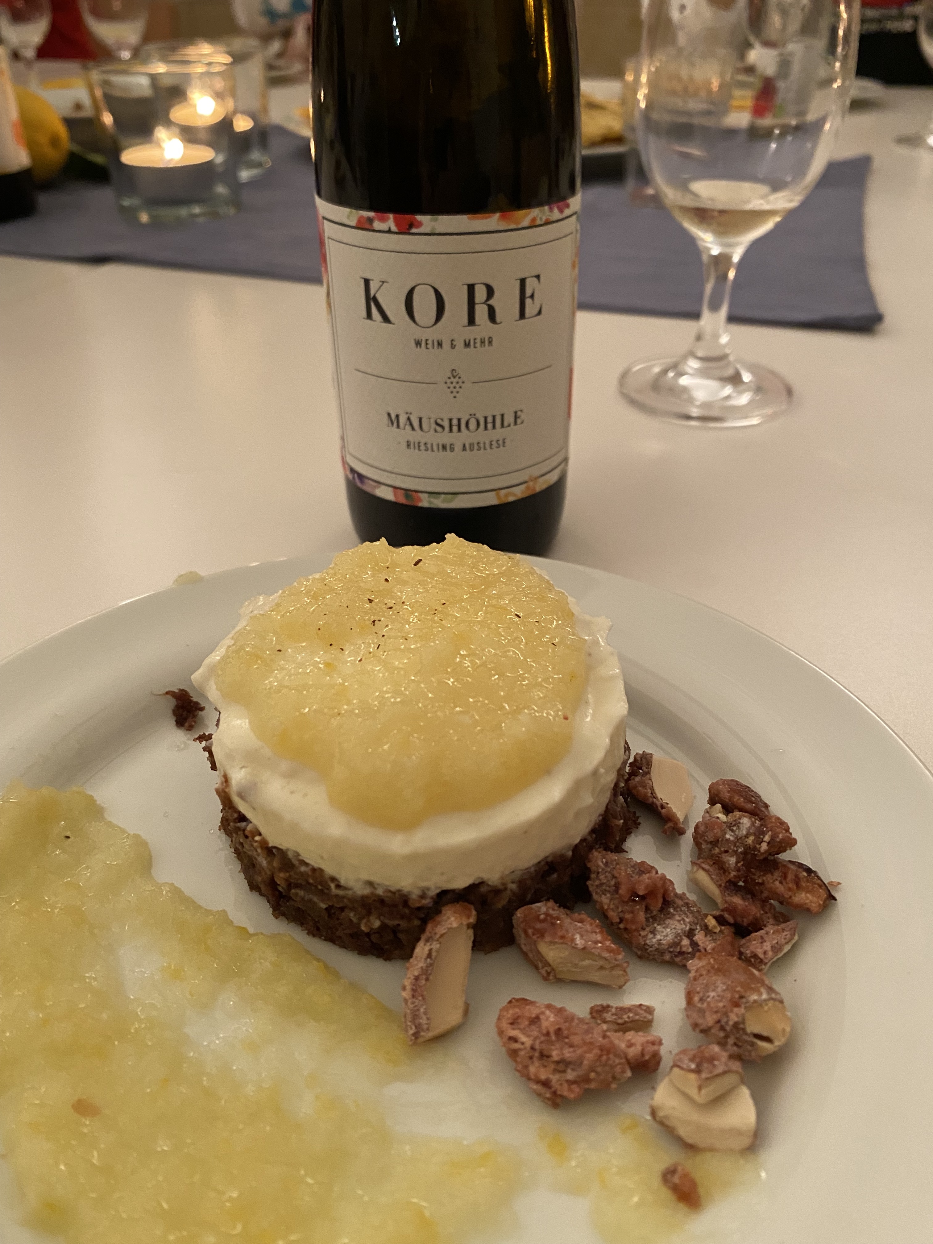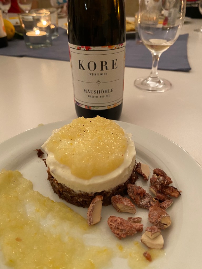 Zum süßen Abschluss die Pastinaken-Schokotörtchen mit Joghurtmousse und noch einmal die Amalfizitronen, diesmal als leckere Creme auf und neben der Mousse. Der Deidesheimer Maushöhle Riesling Auslese begleitete das Dessert ganz hervorragend!