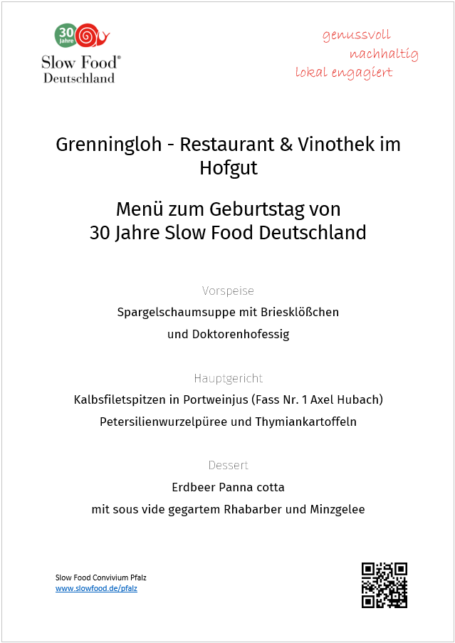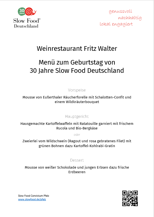 Am 11. Juni feiern wir 30 Jahre Slow Food Deutschland mit unseren Freunden von Slow Food Karlsruhe. In Zusammenarbeit mit einigen unserer Genussführer-Restaurants bieten diese im Laufe des Jahres ein Menü zu diesem Anlass an.