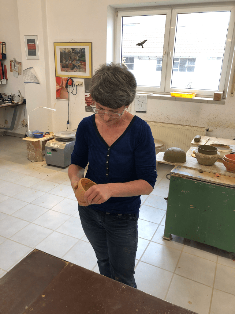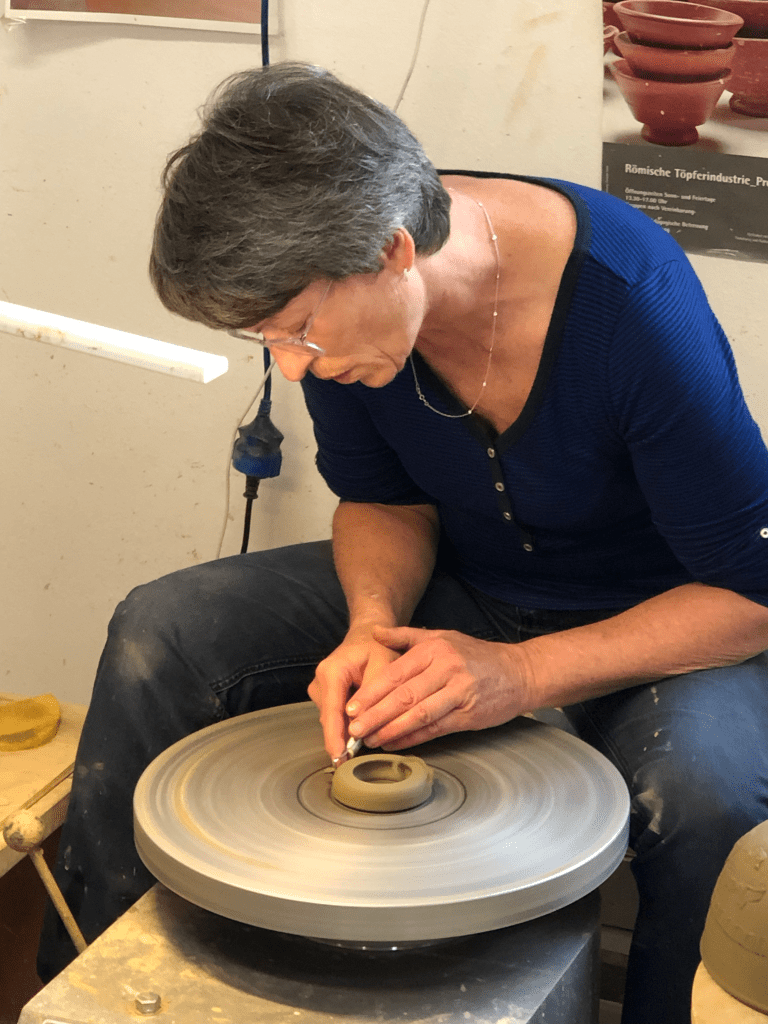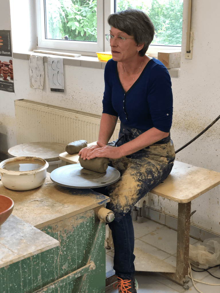 Andrea Weigel bewies ihr Geschick zunächst an der Drehscheibe. Wir waren begeistert, wie schnell sie aus einem Klumpen Ton ein Gefäß formte und anschließend mithilfe von Schlick den Fuß befestigte.