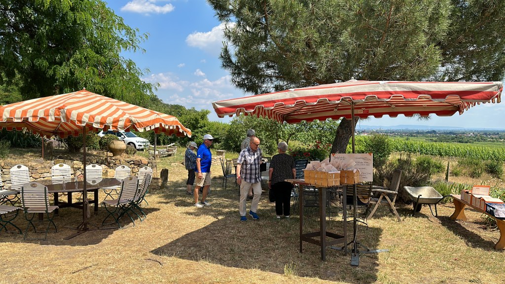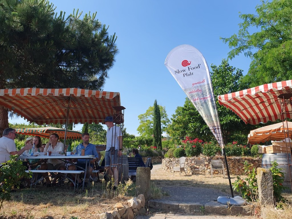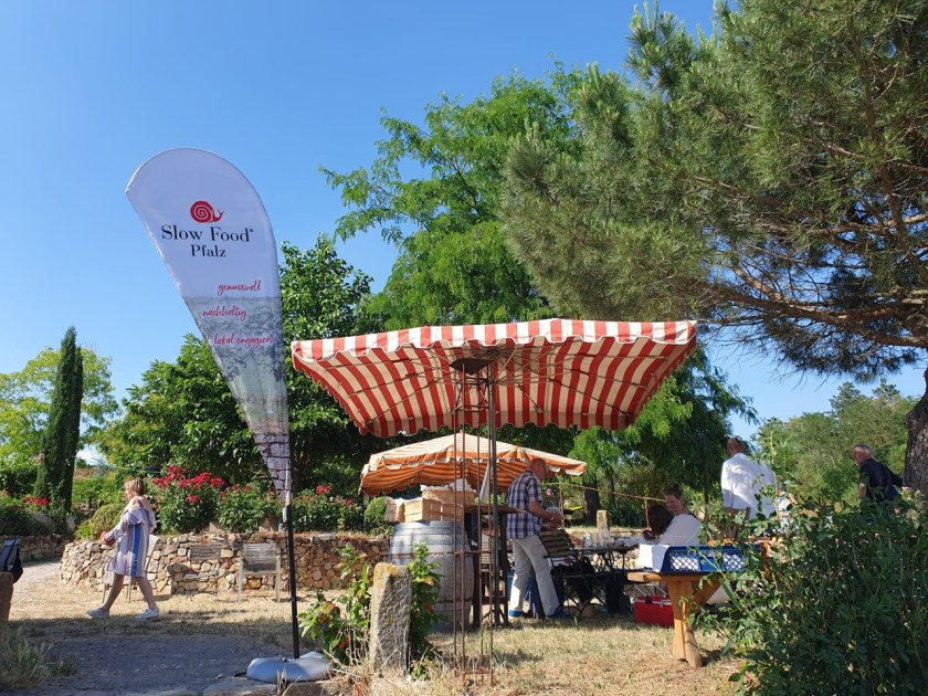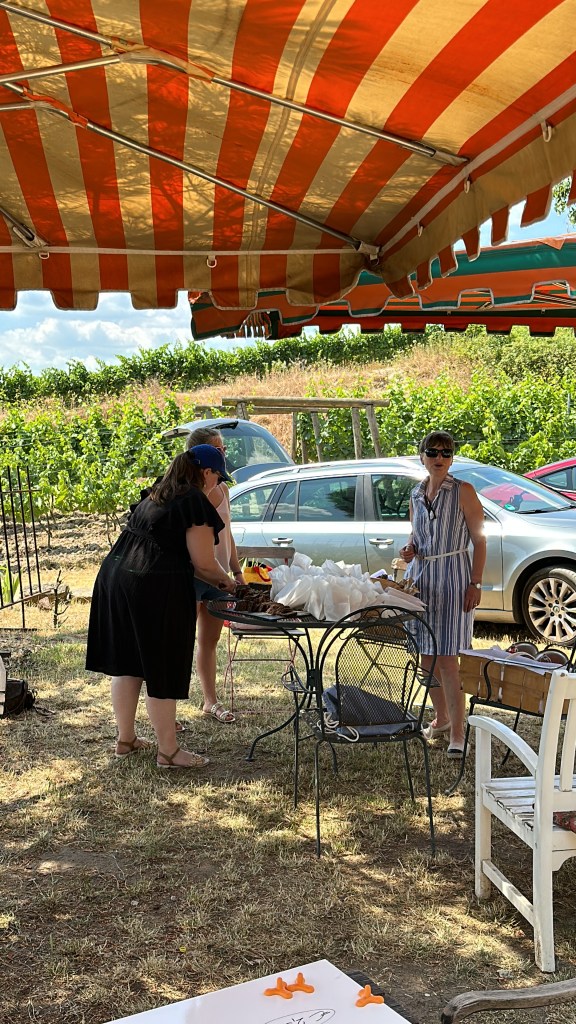 Jeder hatte nach Gusto etwas zum Essen mitgebracht, ein gemeinsamer Grill war angeheizt und unter großen Schirmen, Zypressen und Pinien mit Blick über die Rheinebene, Freinsheim und die Haardt verbrachten wir einen wunderschönen Nachmittag mit Kennenlernen, Gedankenaustausch und Genießen bei Reiboldschem Wein und Traubensaft!