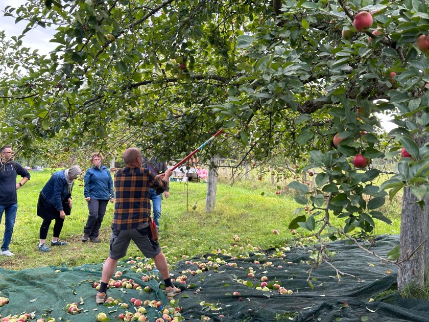 An dem einzigen, noch nicht abgeernteten Baum durften wir mit anpacken und Jannis, Joachim und anderen Helfer bei der Ernte der Äpfel unterstützen. Dabei fanden äußerst interessante, speziell dafür konzipierte Hilfsmittel ihren Einsatz. Hat Spaß gemacht!