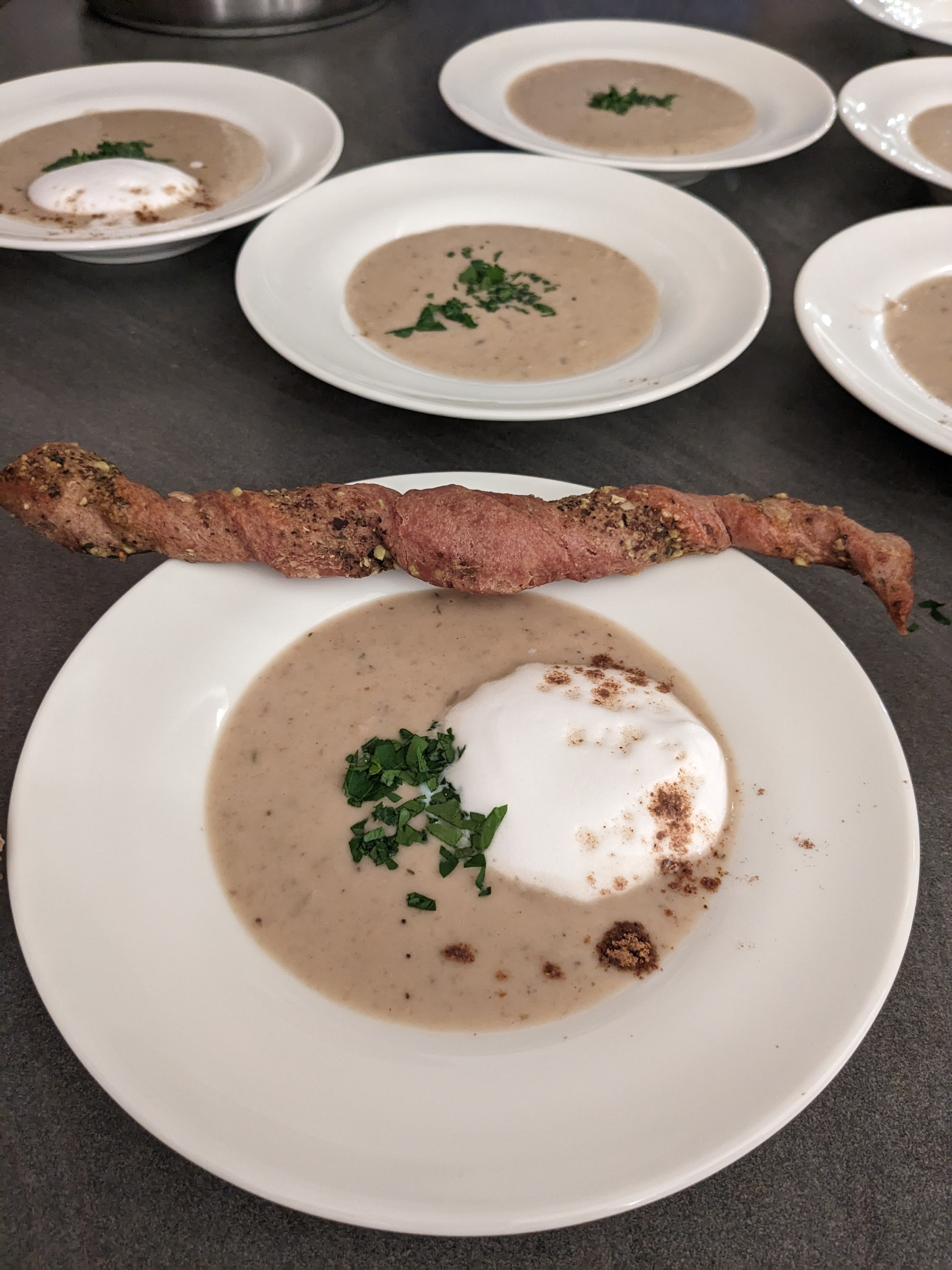 Keeschde-Pastinaken-Suppe mit Haube dazu ein 2021 Pfeddersheimer Riesling (nicht von der Haardt, sondern von unserem neuen Unterstützer Weingut Feth, Flörsheim-Dalsheim) mit Dubbes-Knusperstangen, da wir schon in der Nähe sind, gibt es Dubbes von der Wonnegauer Ölmühle