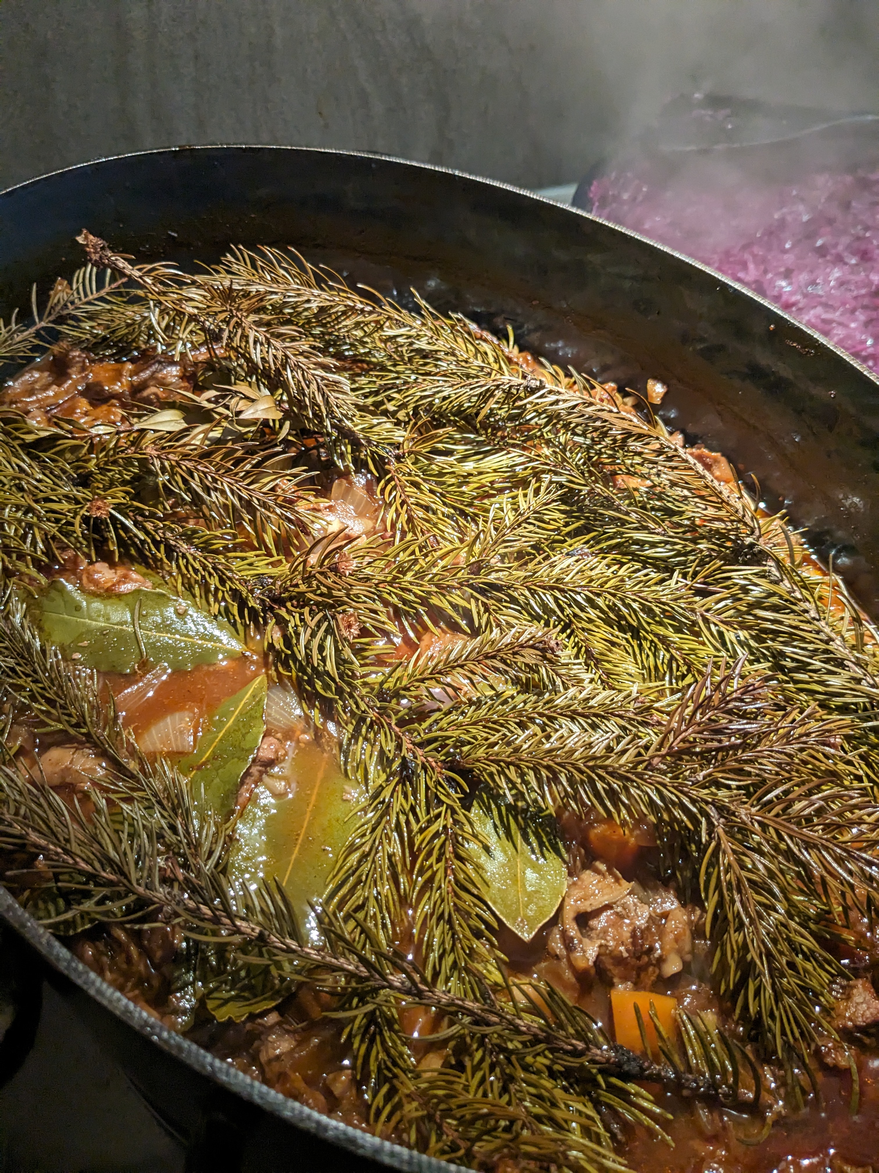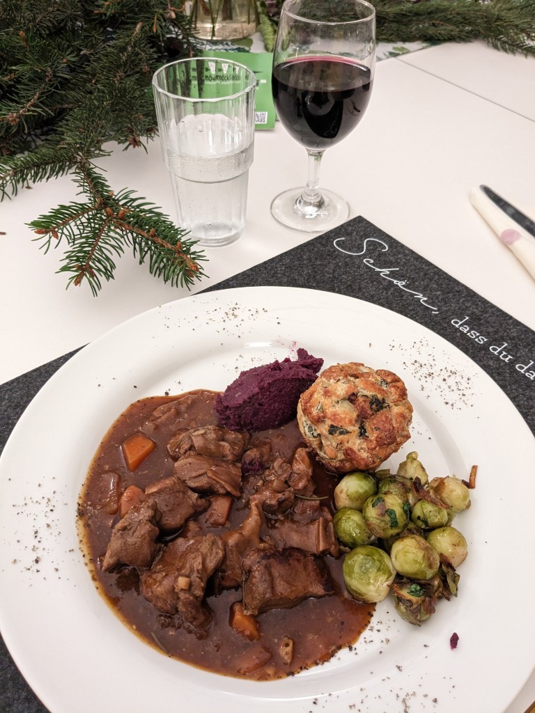 Wildschweinragout unterm Nadelbaum, dazu Rotkohlpüree, gebratener Rosenkohl und Semmelknödelsoufflé begleitet von einer wunderbaren Rotweincuvée, 2021 Mineralstaub