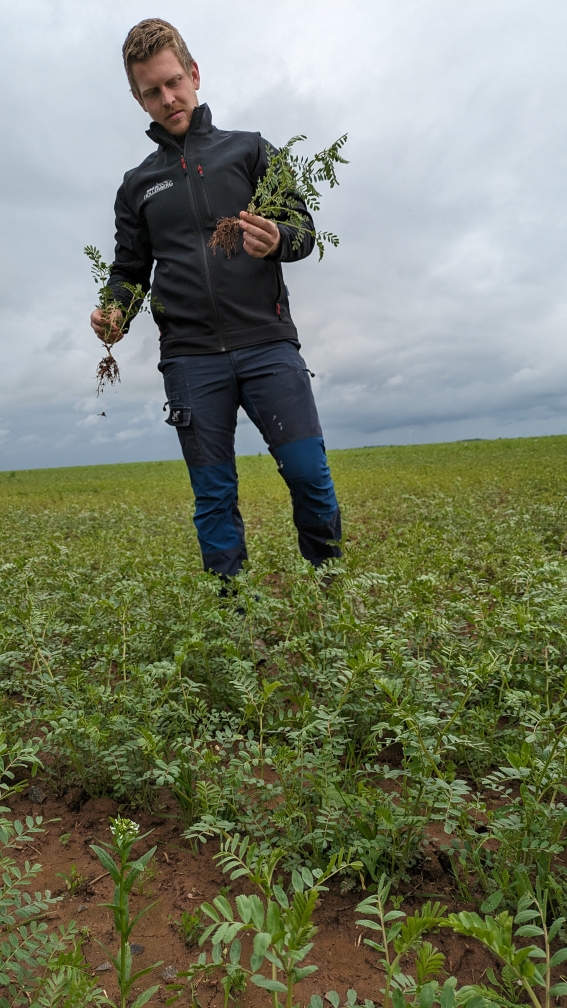 Interessant, Markus erklärt: „Kichererbsen und Lupinen müssen unmittelbar vor der Aussaat geimpft werden, um Stickstoff fixieren zu können, denn da es eine neue Frucht für den Boden ist, gibt es die Knöllchenbakterien im Boden nicht, diese müssen angeimpft werden. Heimische Sorten wie Klee müssen nicht geimpft werden.“
