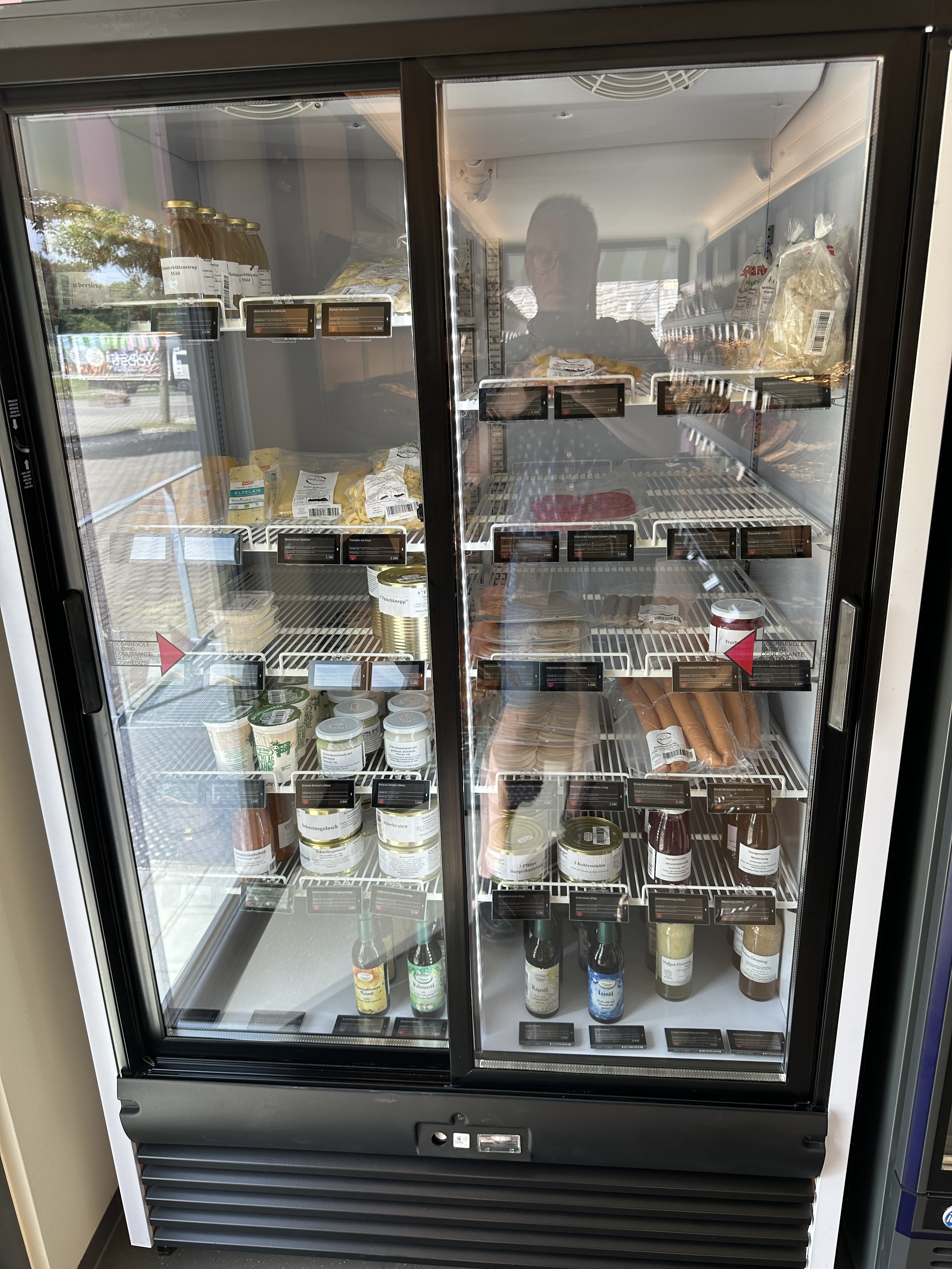Auf dem Parkplatz vor dem Adamshof bei Kandel steht ein großer grauer Schiffscontainer – umgebaut zu einem kleinen Selbstbedienungsmarkt für regionale Produkte. Nach dem Öffnen der Tür mittels EC-Karte betritt man einen klimatisierten Raum mit Regalen und Kühlschränken, in dem diverse Produkte aus der Region angeboten werden – viele davon in Bio-Qualität. Das Angebot sieht durchaus ansprechend aus. Neben Obst und Gemüse gibt es u.a. Dosenwurstwaren, Marmeladen, Getreideprodukte, Säfte und sogar Eis. Das Angebot wird täglich kontrolliert und aufgefüllt.