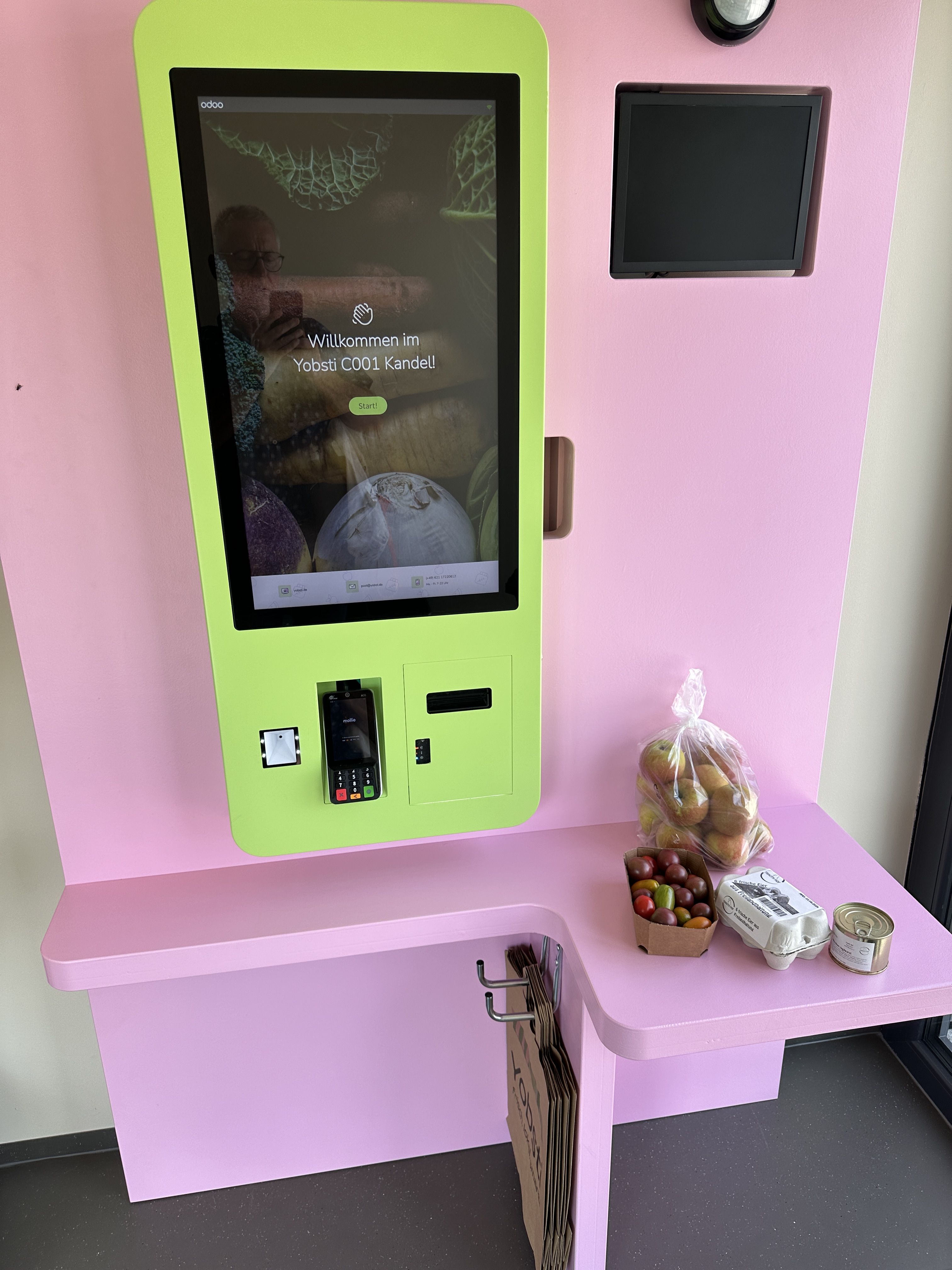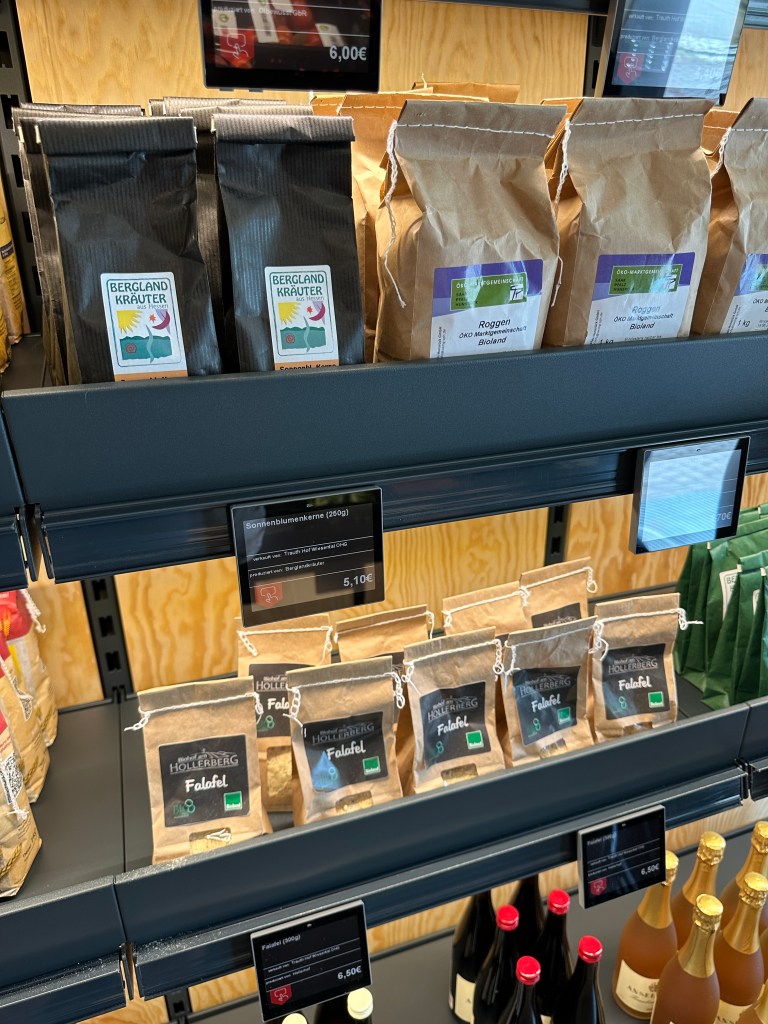 Man bedient sich selber, und zahlt – nach dem Einscannen der Produkte an dem „Terminal“ -einfach wieder mittels EC-Karte. Simpel und praktisch… und man kann hier jeden Tag von 07:00 bis 22:00Uhr einkaufen.