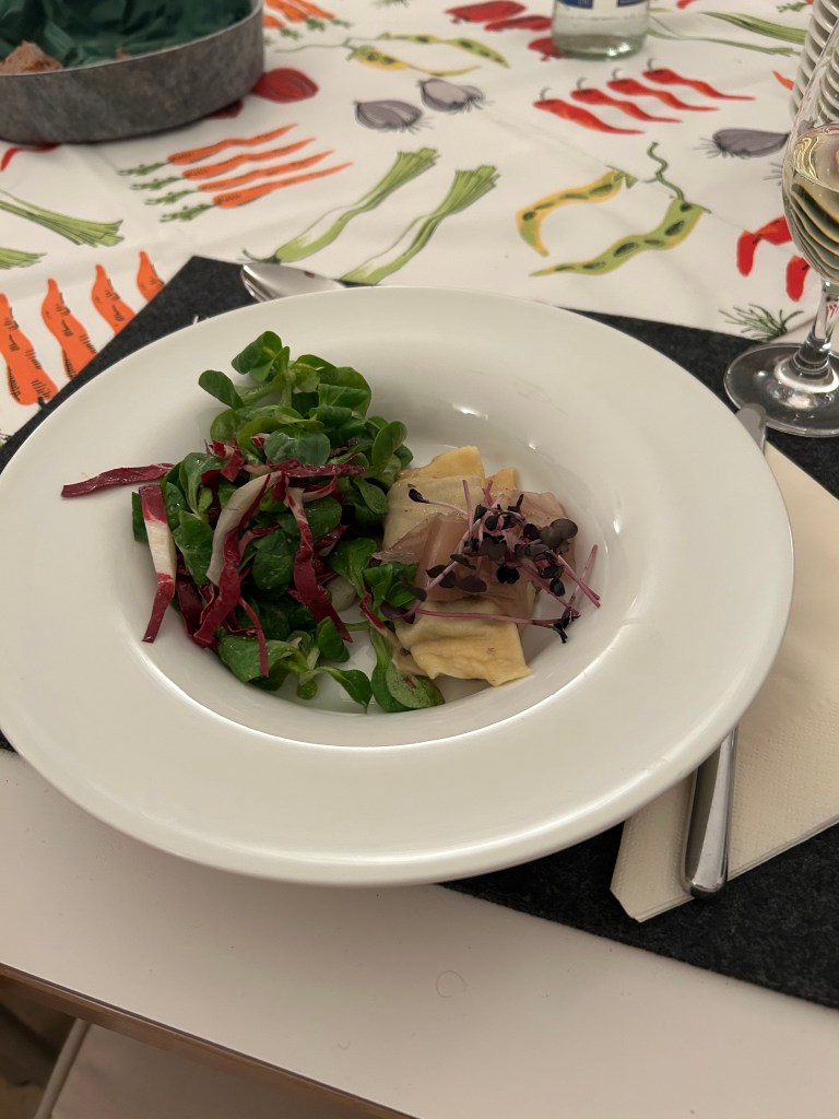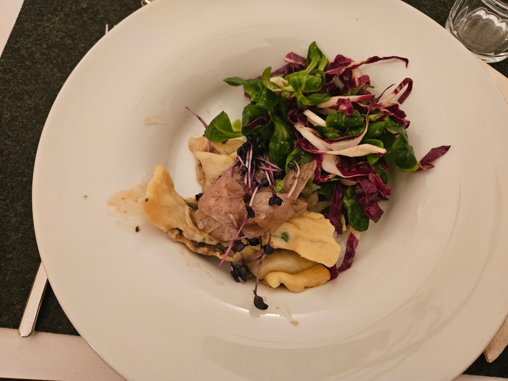 Zur Vorspeise gab es Alblinsenmaultaschen, die von fermentiertem Filderkraut (Spitzkohlart von den Fildern) getoppt und in Schwarzwald-MISO Butter geschwenkt wurden.