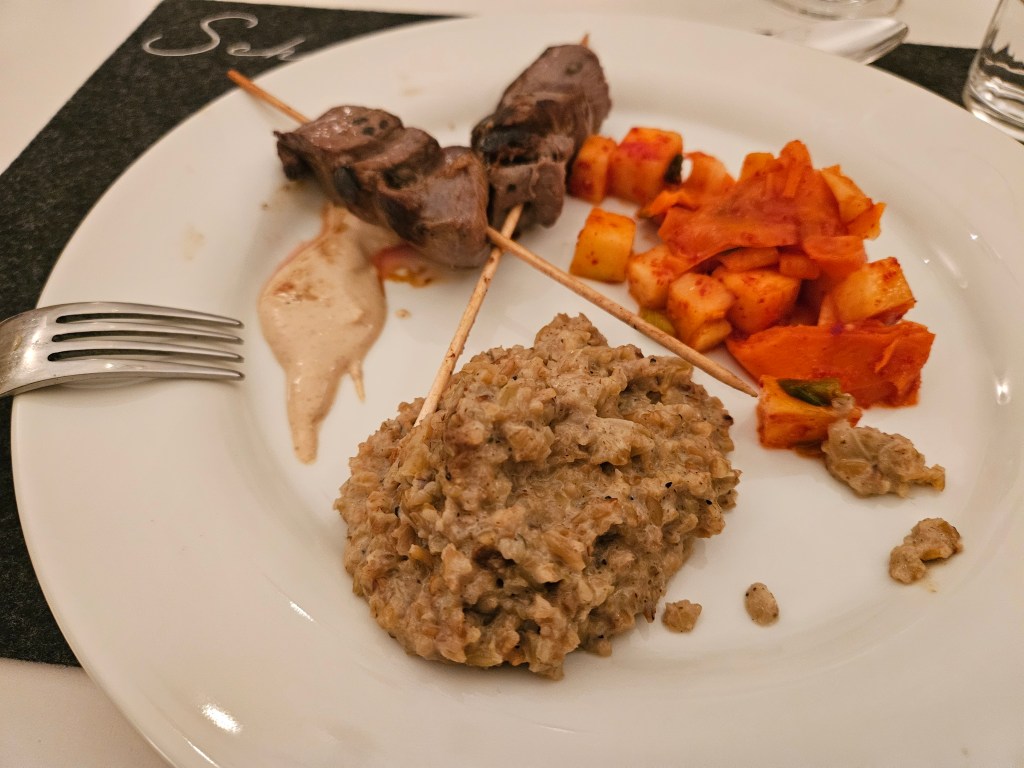 Im Hauptgang bereiteten wir Rehspieße, eine Hälfte in Shio Koji eingelegt, der Unterschied in Geschmack und Textur zu den naturbelassenen Fleischstücken war schon nach kurzer Marinierzeit deutlich spürbar, Grünkern als Risotto und ein Kohlrabi“kimchi“ sowie eine MISO creme zu.