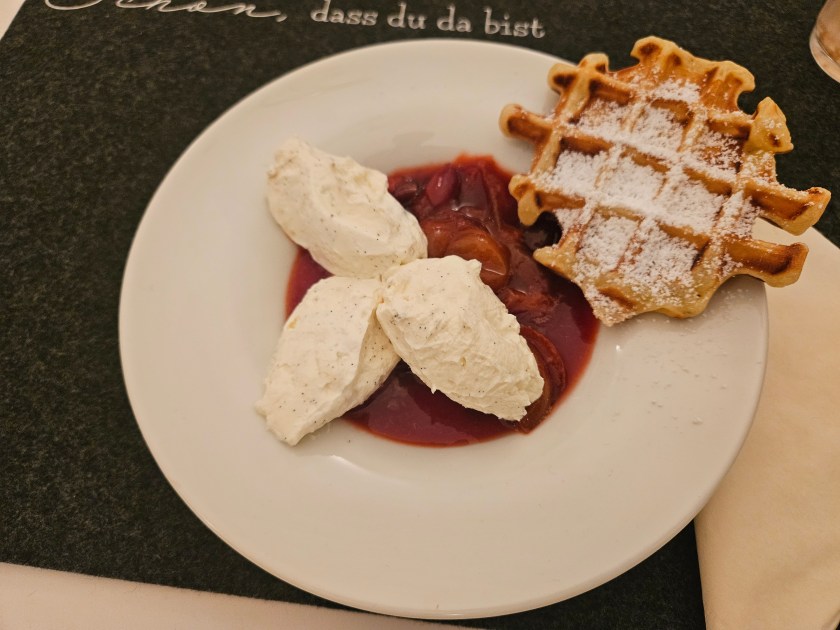 Zum Dessert dann Vanillejoghurt -Nocken, Joghurt auch ein Ferment, mit Rotem Mirabellenröster und Sauerteigwaffeln.